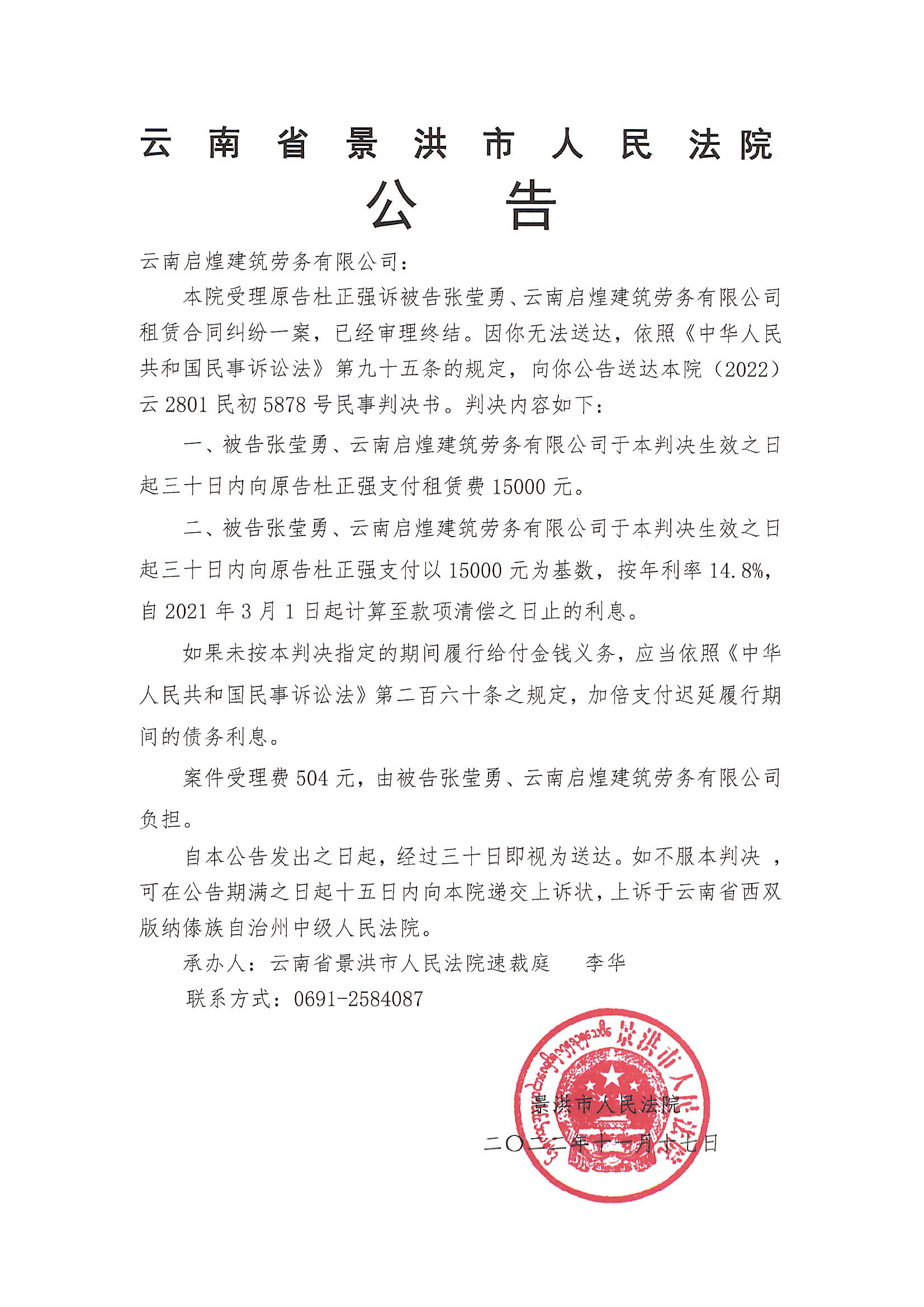 云南启煌建筑劳务有限公司(判决公告)