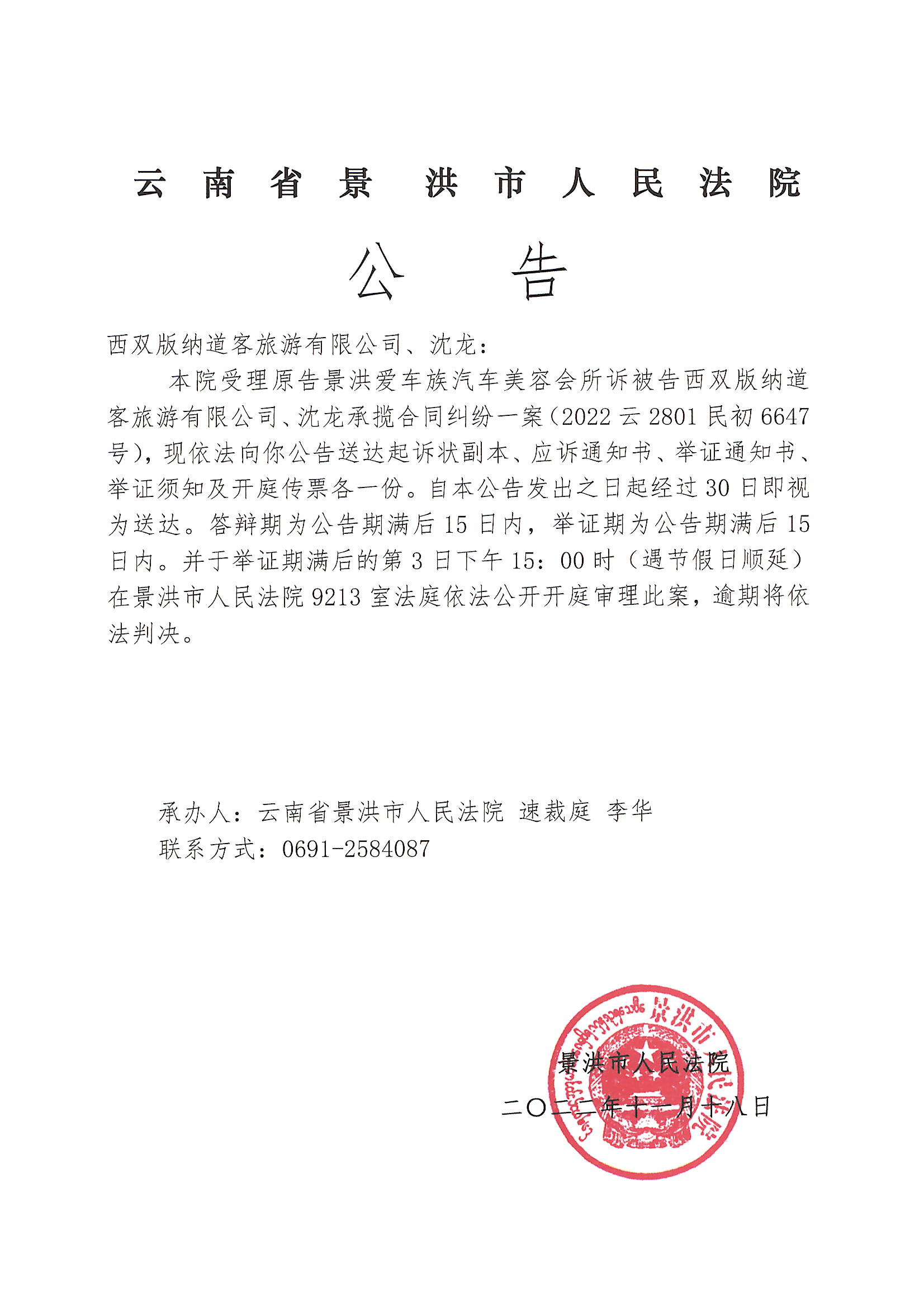 西双版纳道客旅游有限公司、沈龙(传票公告)