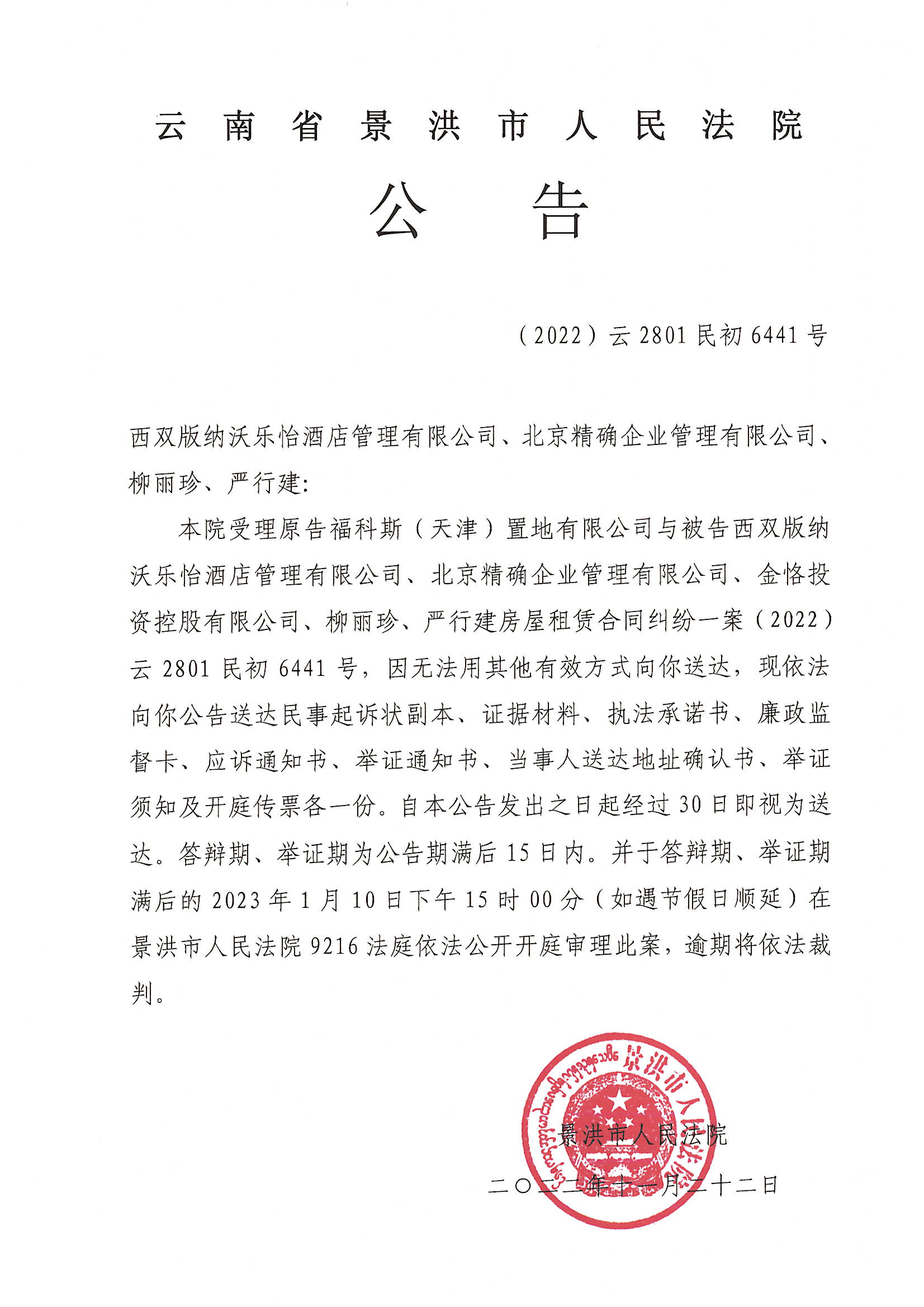 西双版纳沃乐怡酒店管理有限公司、北京精确企业管理有限公司、柳丽珍、严行建(开庭公告(2022)6441)