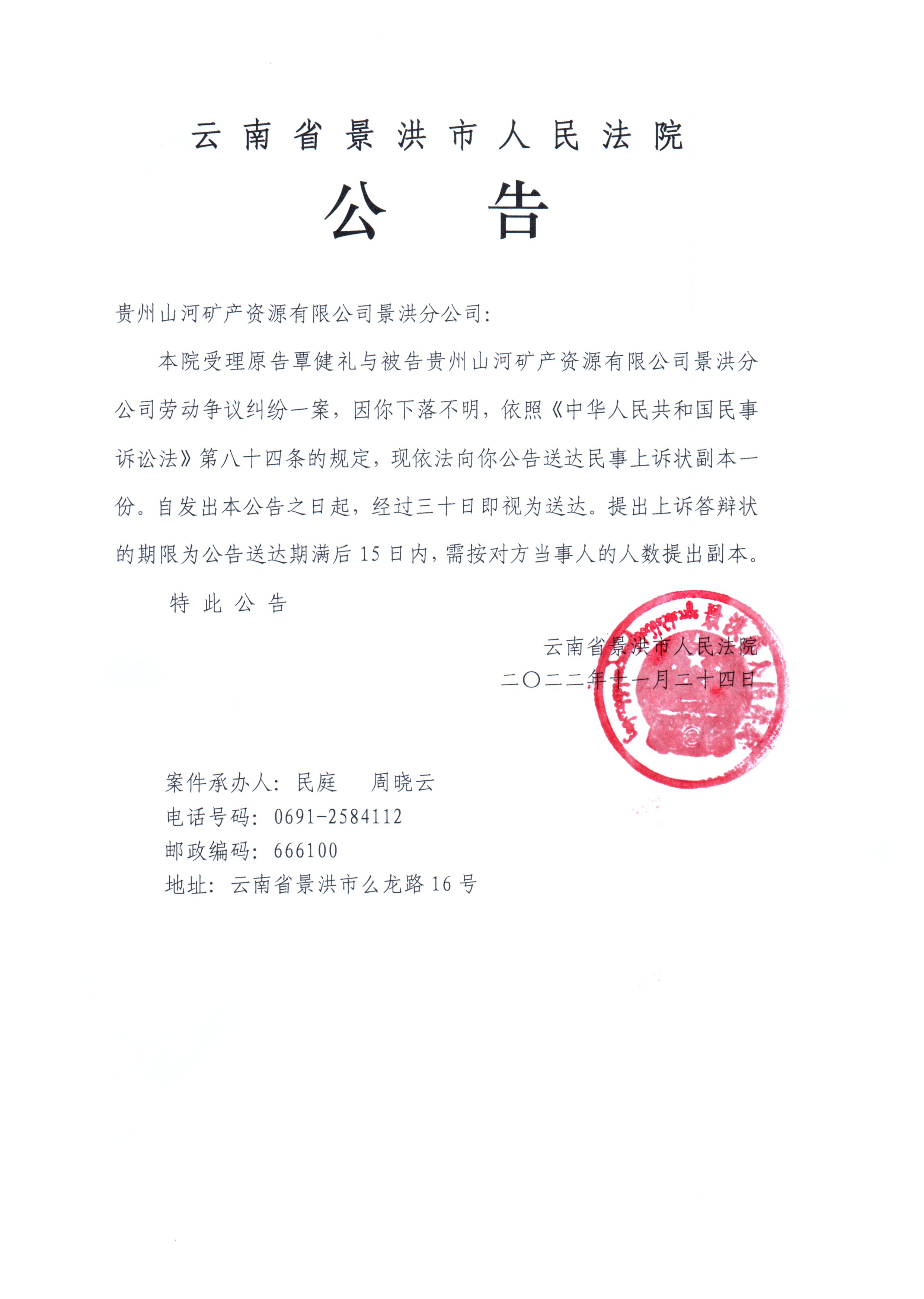 贵州山河矿产资源有限公司景洪分公司(上诉公告)