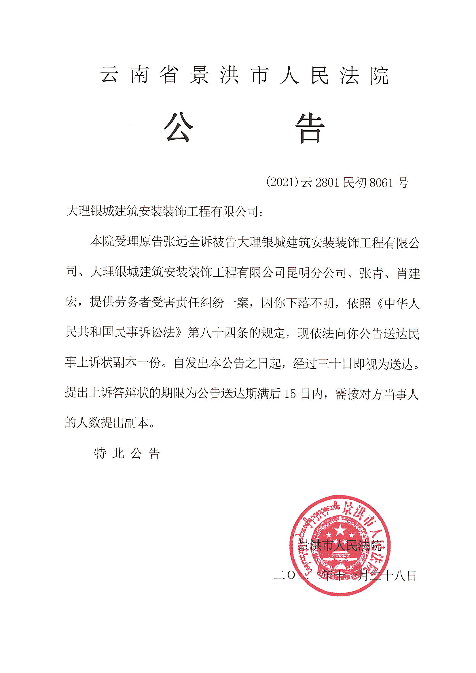 大理银城建筑安装装饰工程有限公司(上诉状公告)