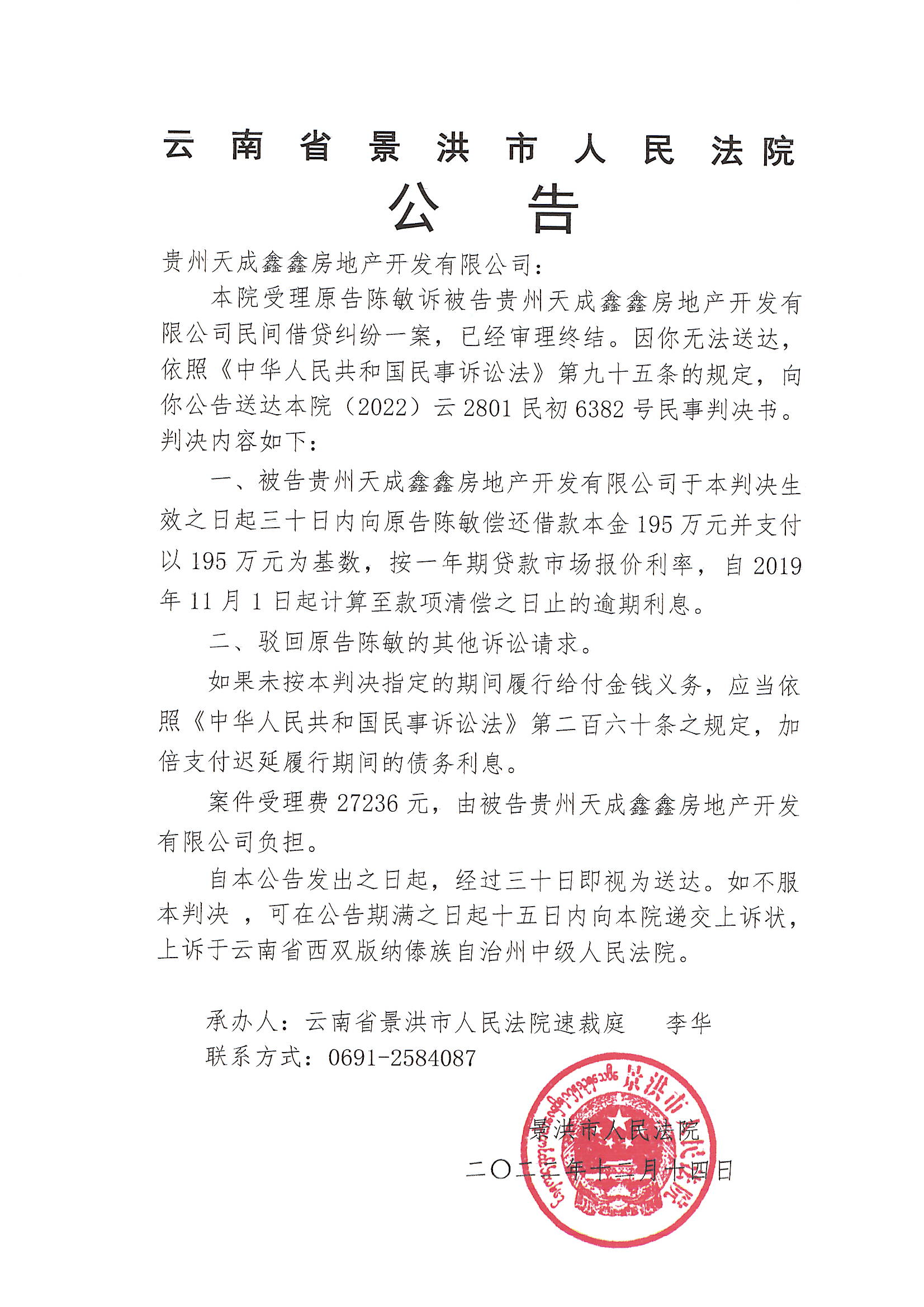贵州天成鑫鑫房地产开发有限公司(判决公告)