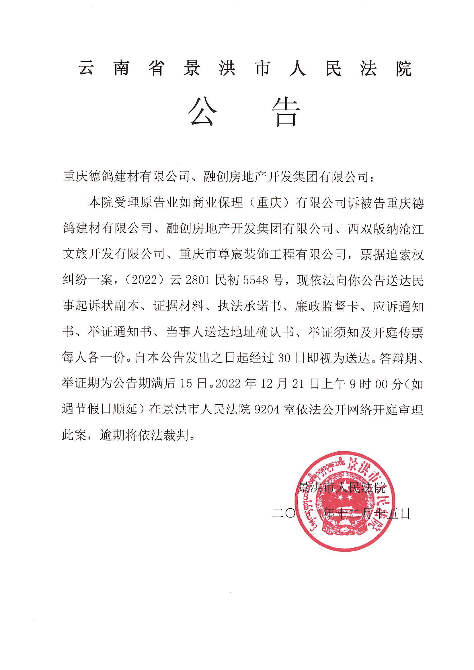 重庆德鸽建材有限公司、融创房地产开发集团有限公司(开庭公告)