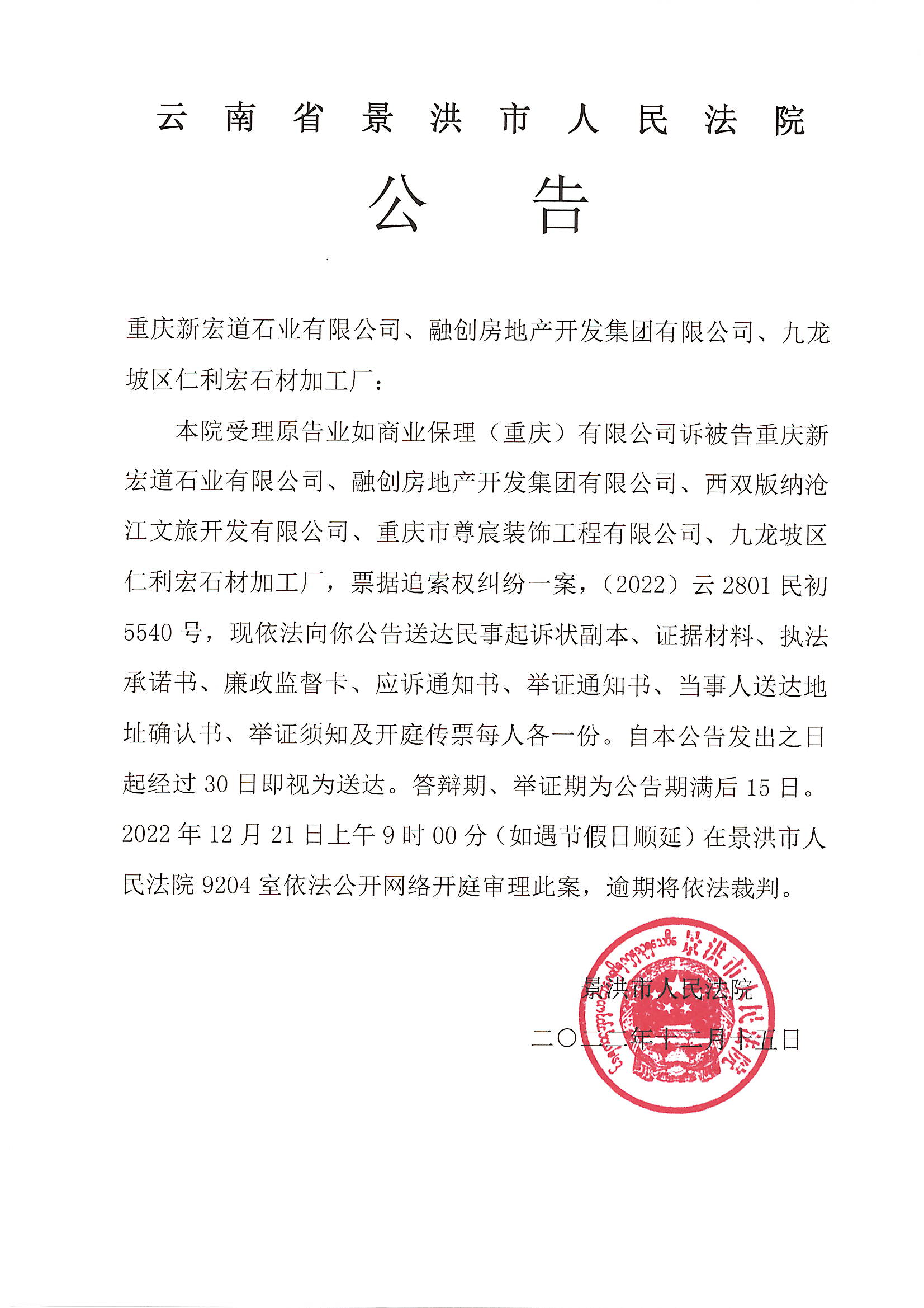 重庆新宏道石业有限公司、九龙坡区仁利宏石材加工厂、融创房地产开发集团有限公司(开庭公告)