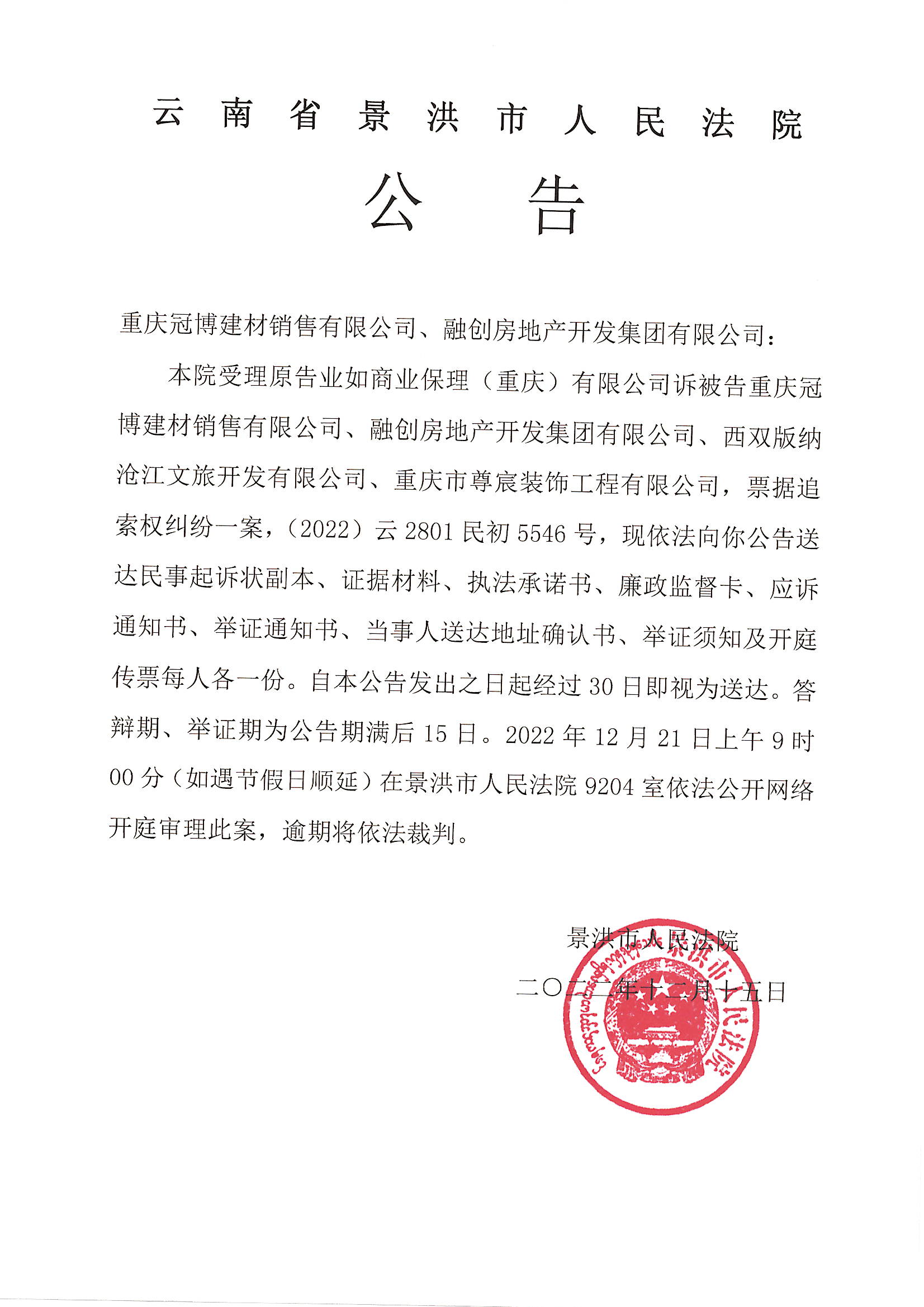 重庆冠博建材销售有限公司、融创房地产开发集团有限公司(开庭公告)