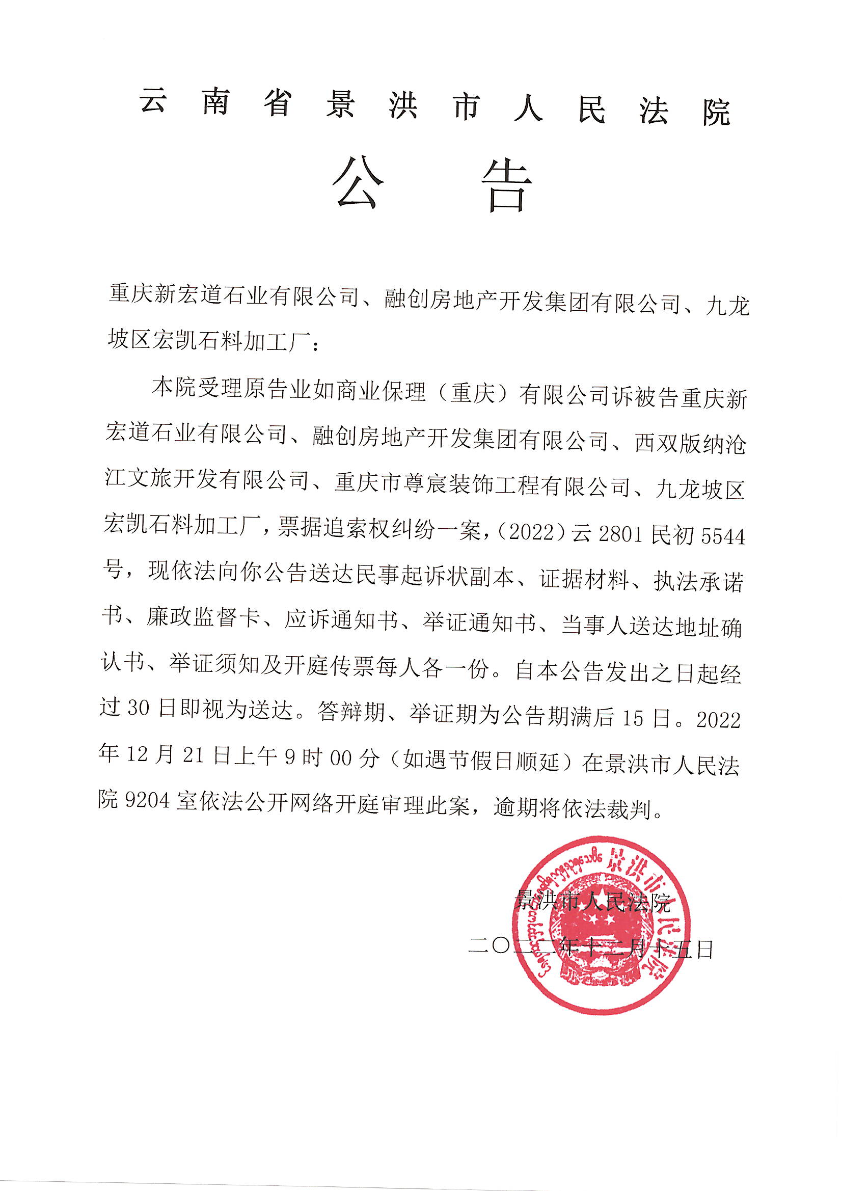 重庆新宏道石业有限公司、九龙坡区宏凯石料加工厂、融创房地产开发集团有限公司(开庭公告)