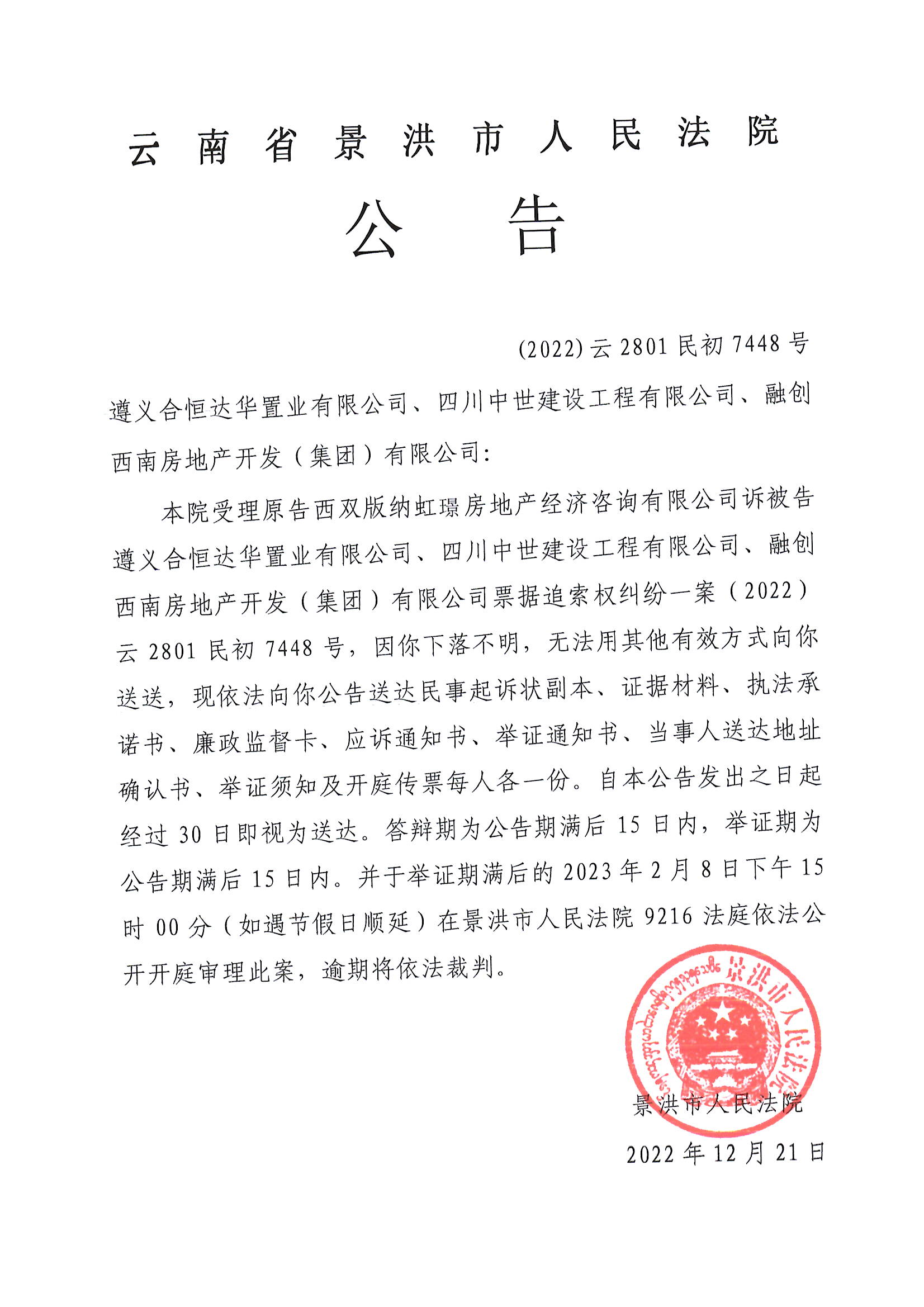 遵义合恒达置业有限公司、四川中世建设工程有限公司等(开庭)