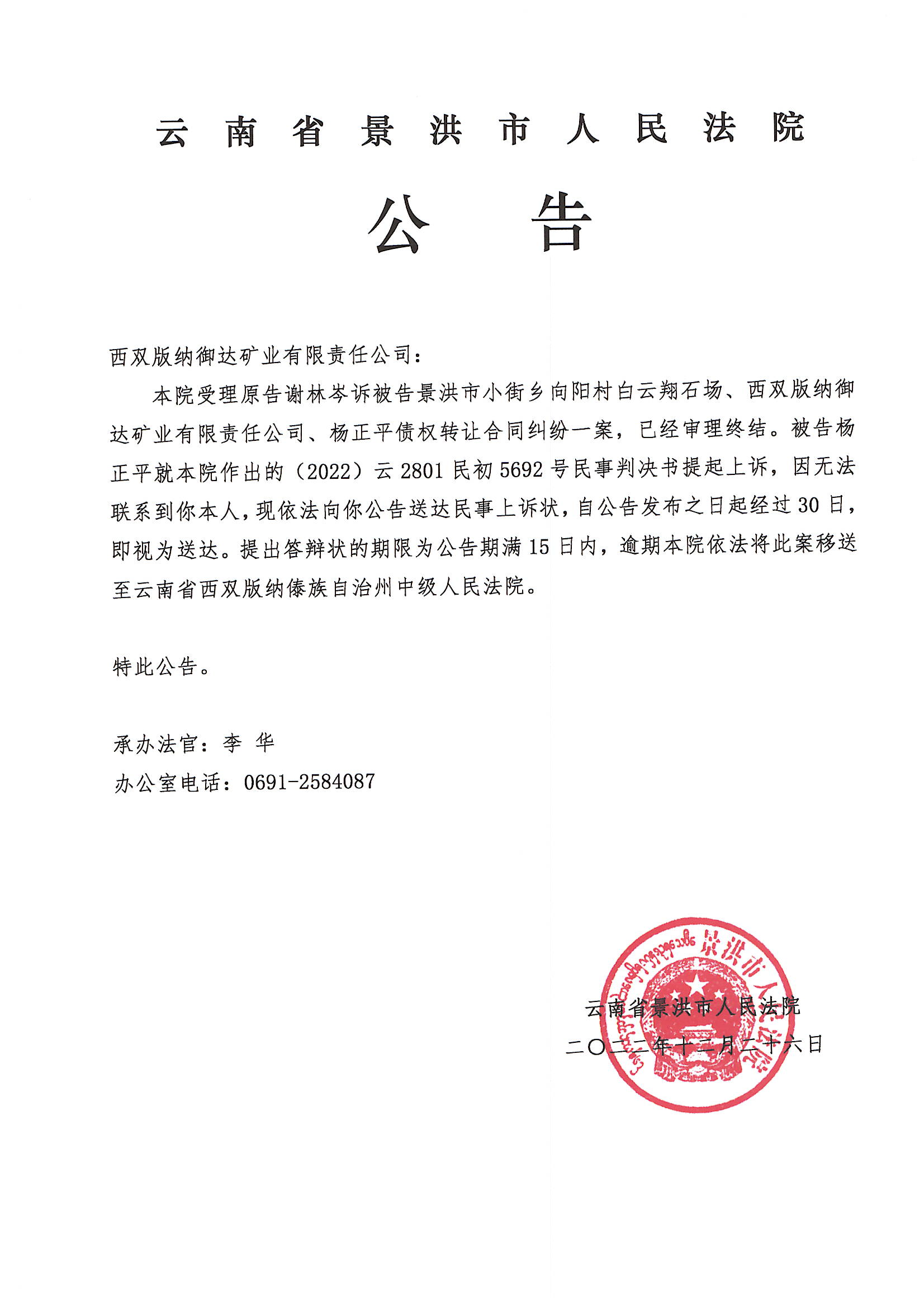 西双版纳御达矿业有限责任公司(上诉状公告)