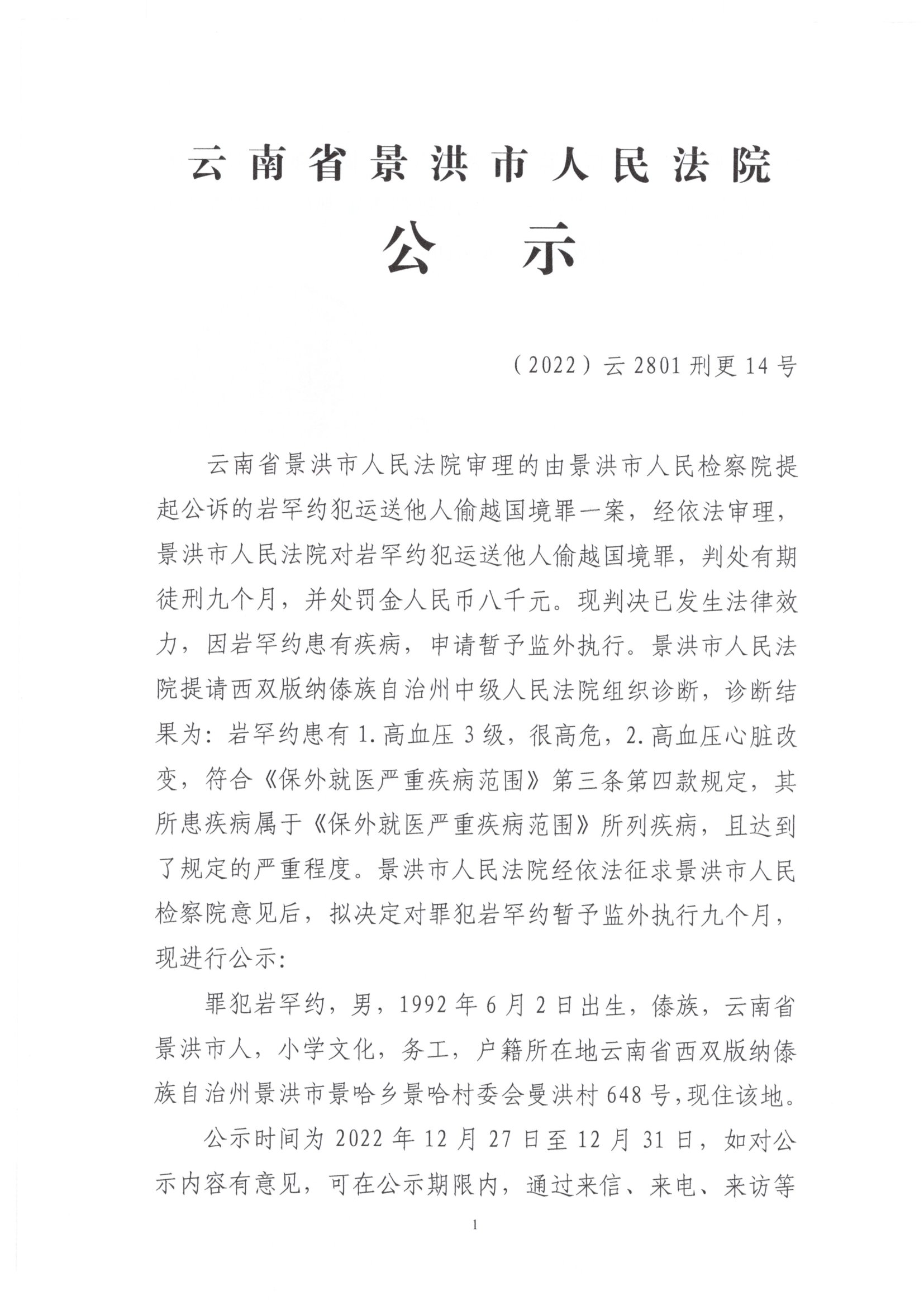 罪犯岩叫犯运送他人偷越国境罪(暂予监外执行)