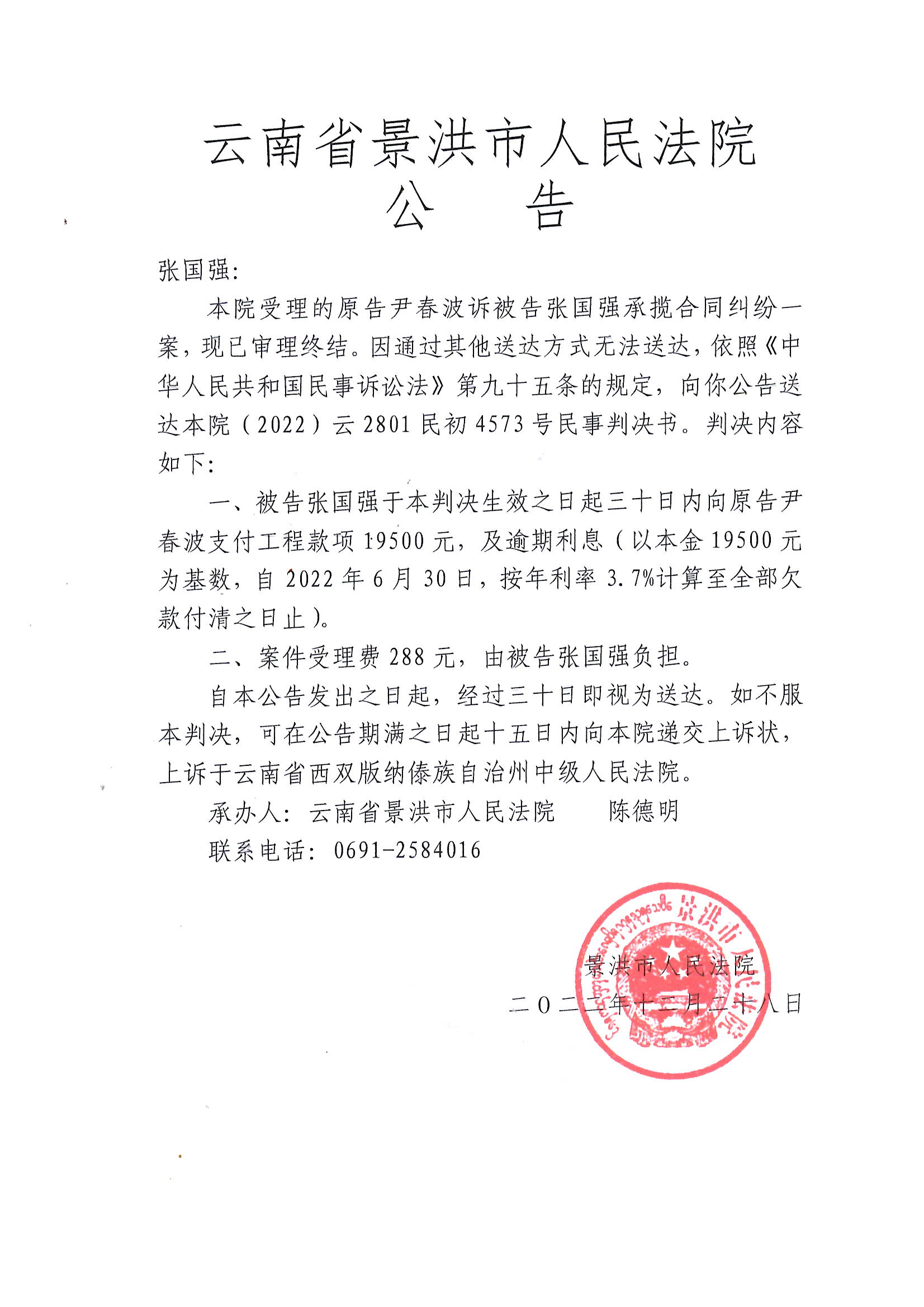 (2022)云2801民初4573判决公告-张国强