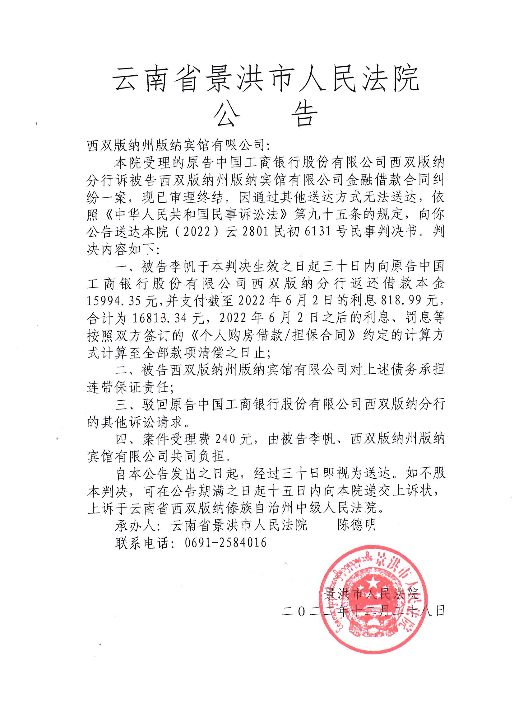 (2022)云2801民初6131判决公告-西双版纳州版纳宾馆有限公司
