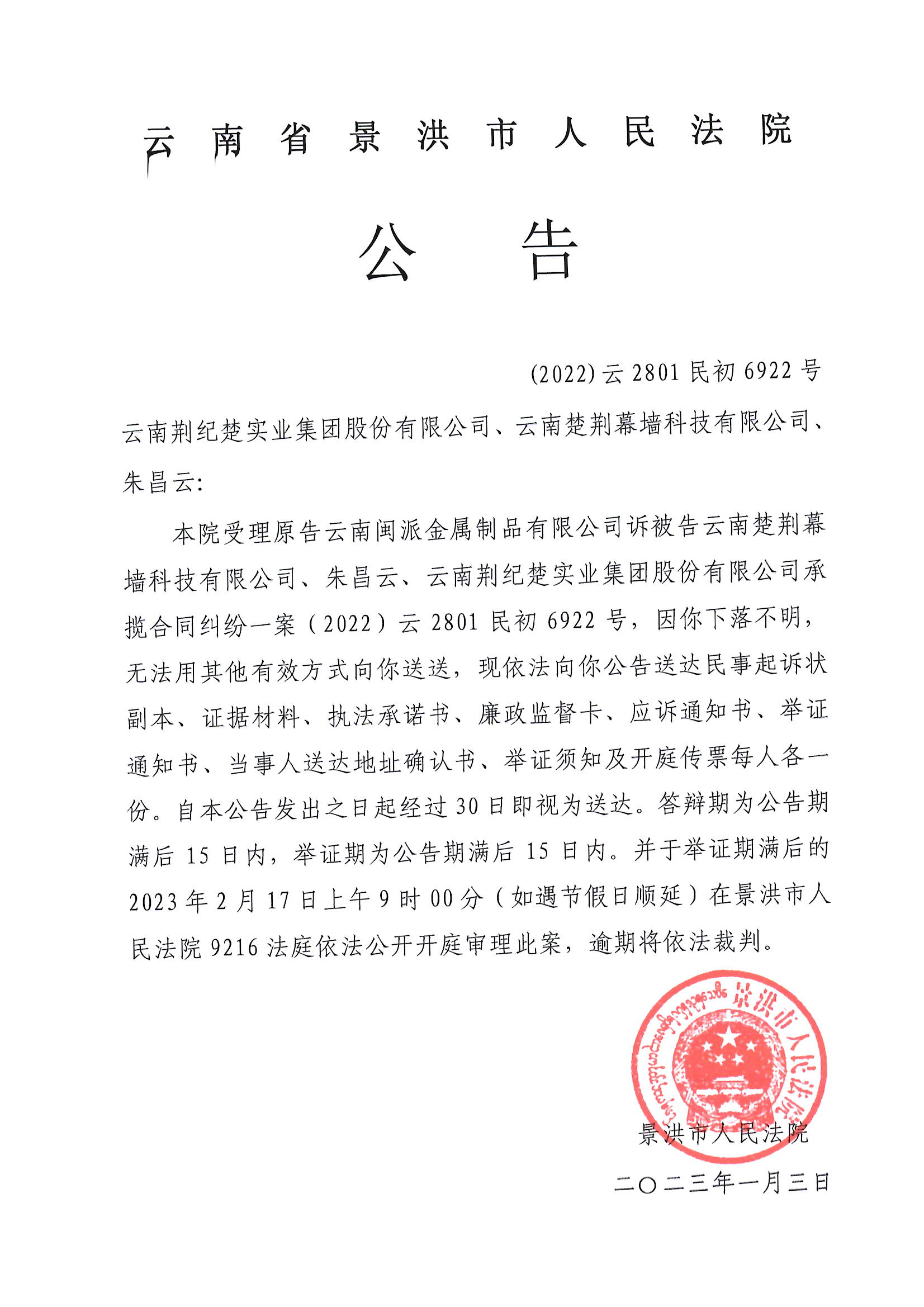 云南荆纪楚实业集团股份有限公司、云南楚荆幕墙科技有限公司等(开庭)