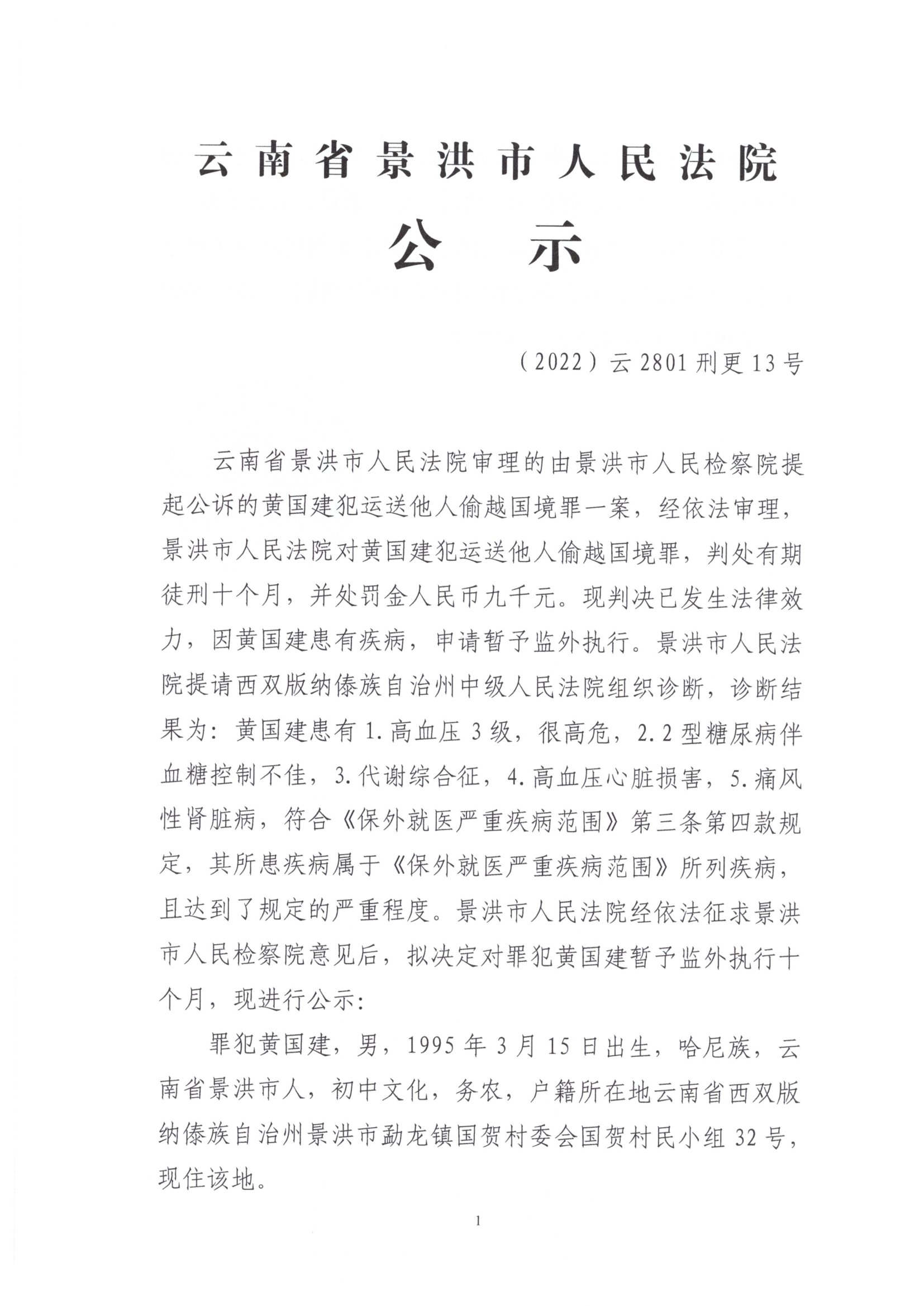 罪犯黄国建犯运送他人偷越国境罪(暂予监外执行)