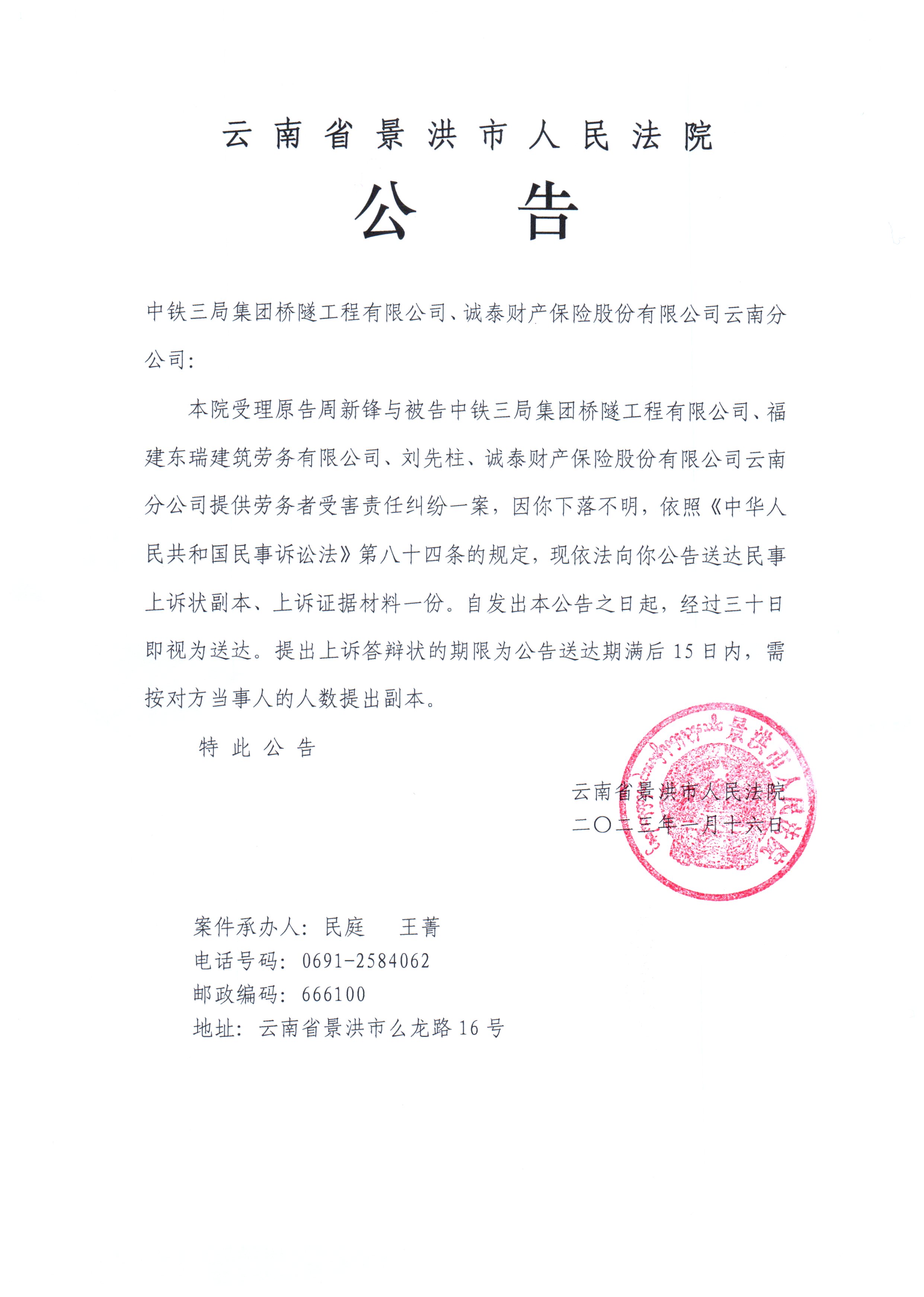 中铁三局集团桥隧工程有限公司、诚泰财产保险股份有限公司云南分公司(上诉公告)