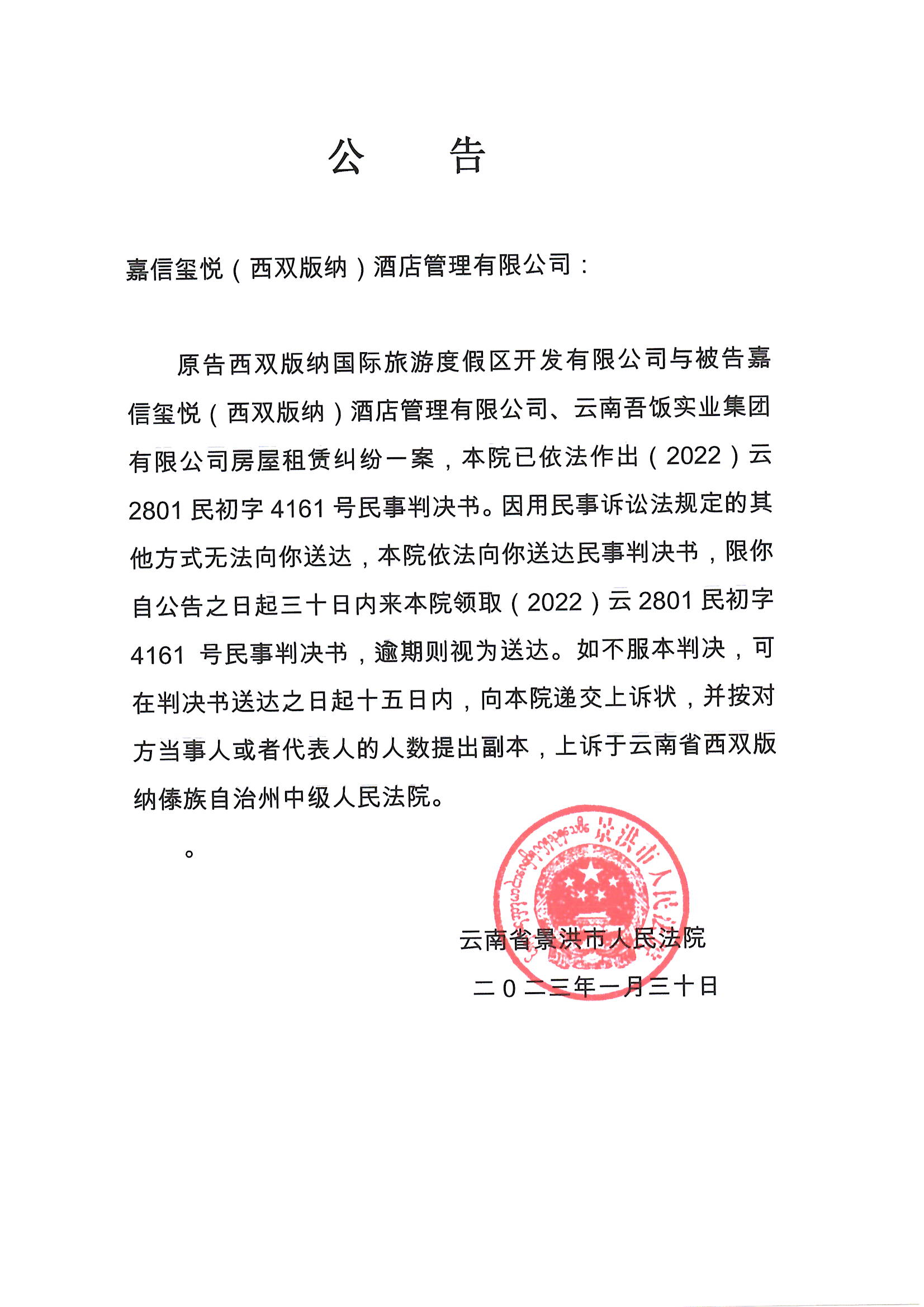 嘉信玺悦(西双版纳)酒店管理有限公司 判决公告
