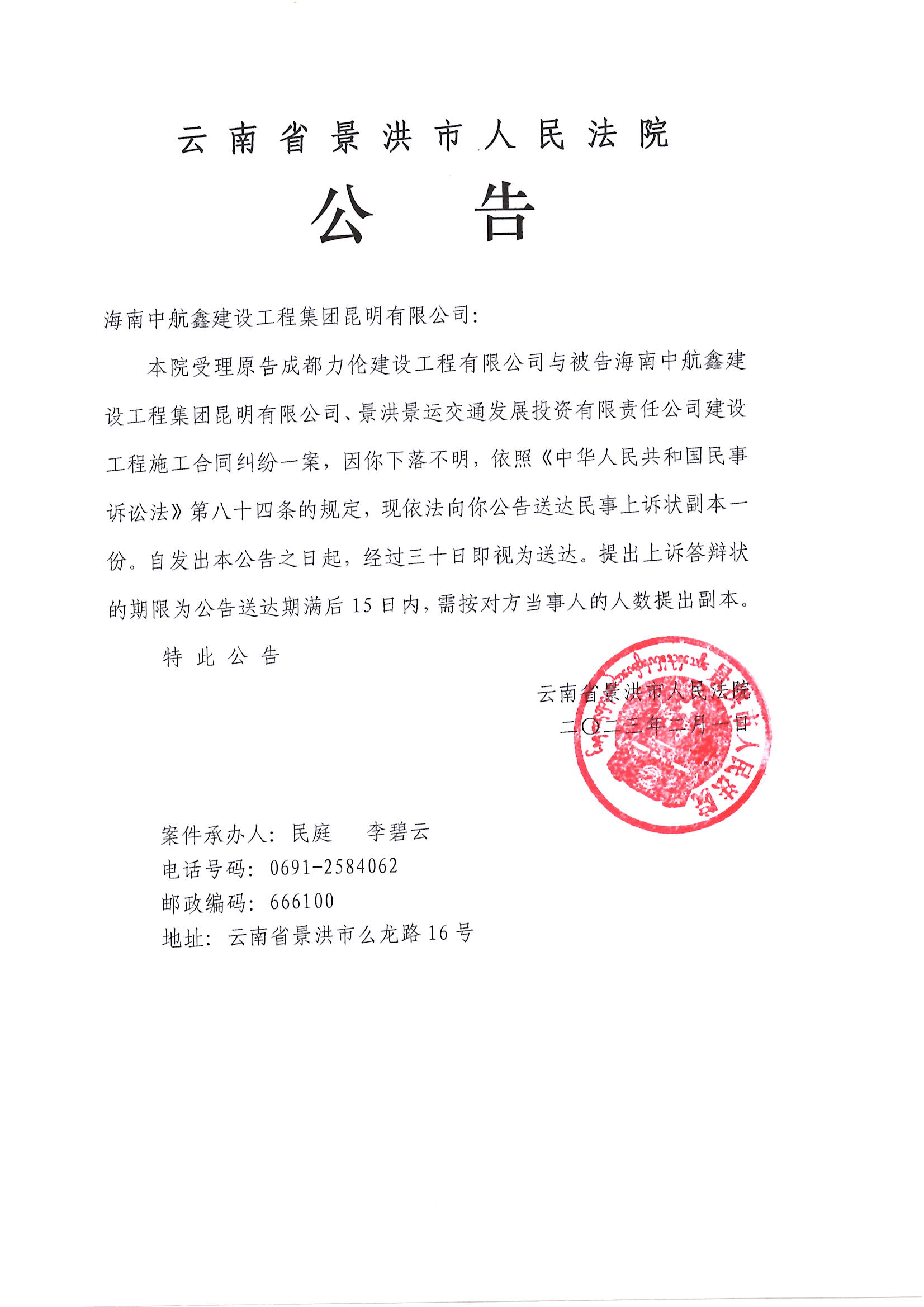 海南中航鑫建设工程集团昆明有限公司(上诉公告)