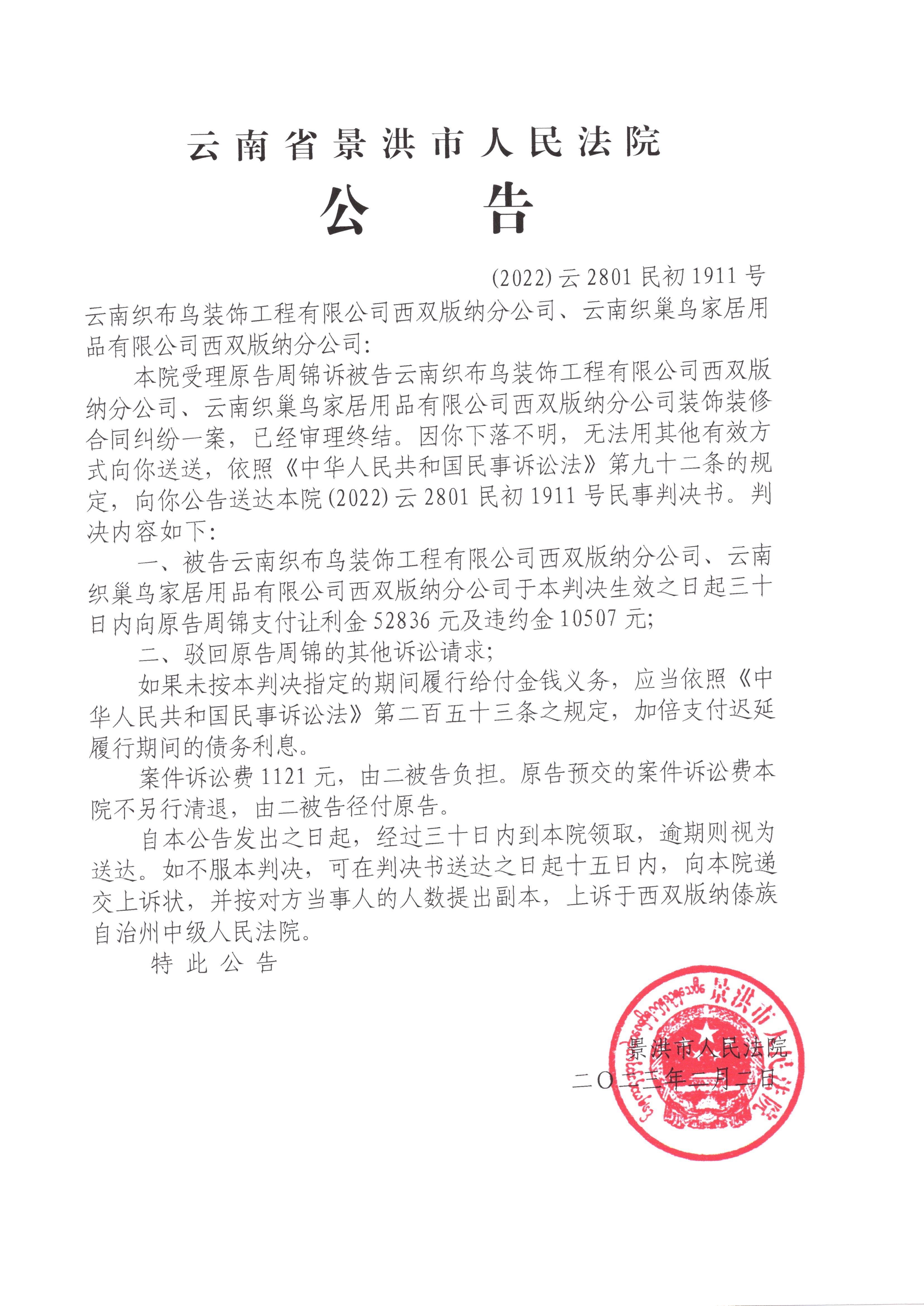 云南织布鸟装饰工程有限公司西双版纳分公司、云南织巢鸟家居用品有限公司西双版纳分公司(判决公告)