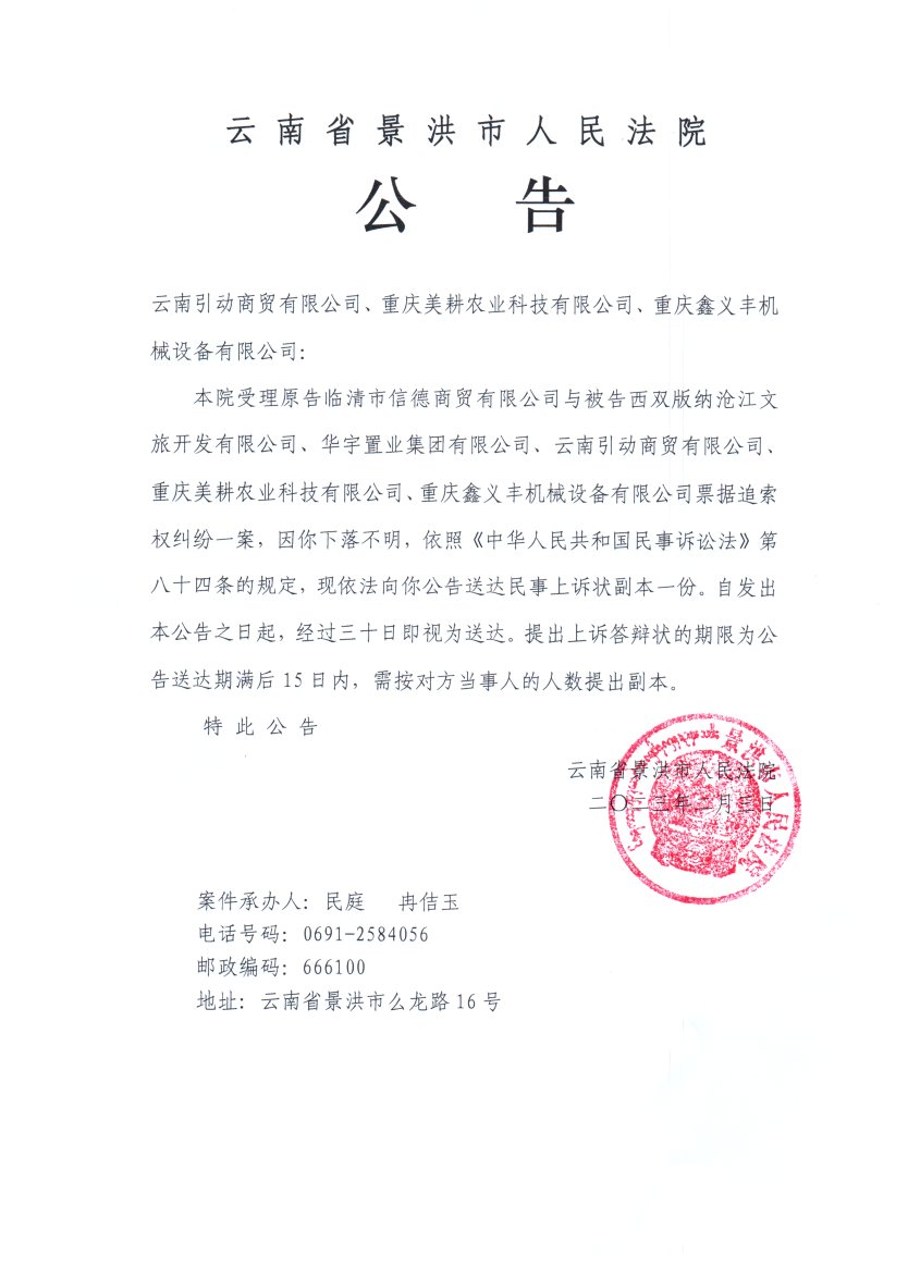 云南引动商贸有限公司、重庆美耕农业科技有限公司、重庆鑫义丰机械设备有限公司(公告)