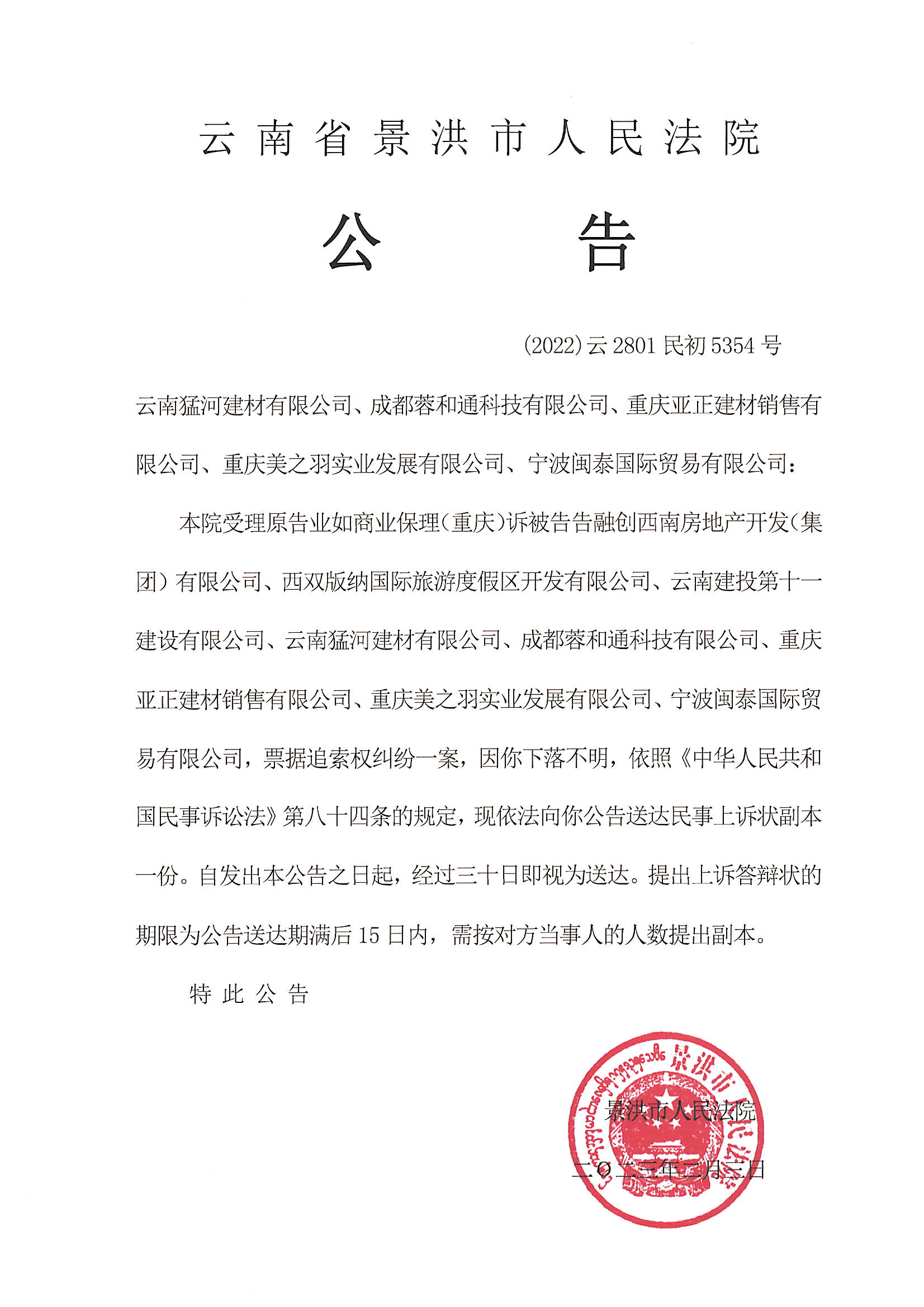 云南猛河建材有限公司、成都蓉和通科技有限公司、重庆亚正建材销售有限公司、重庆美之羽实业发展有限公司、宁波闽泰国际贸易有限公司(上诉状公告)