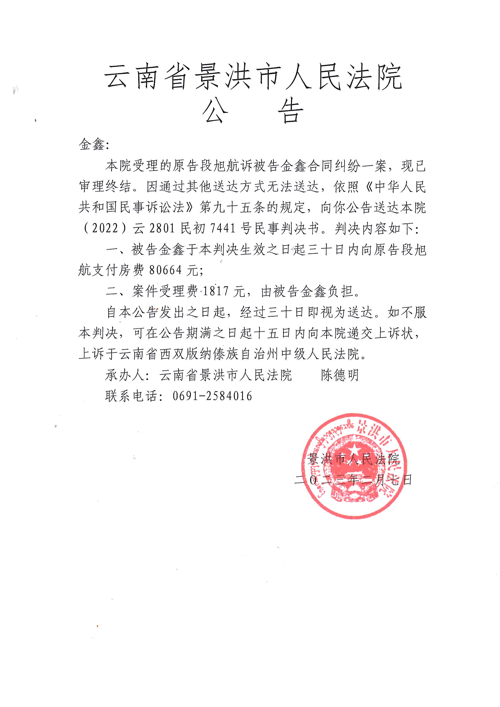 公告:金鑫(2022)云2801民初7441号民事判决书