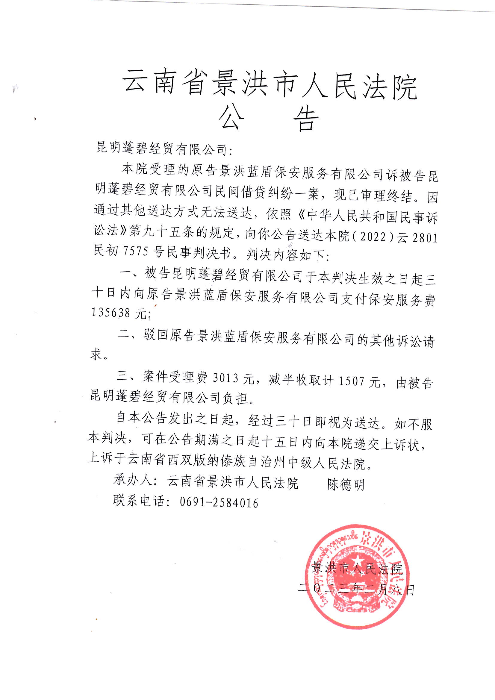 判决公告:昆明蓬碧经贸有限公司(2022)云2801民初7575号