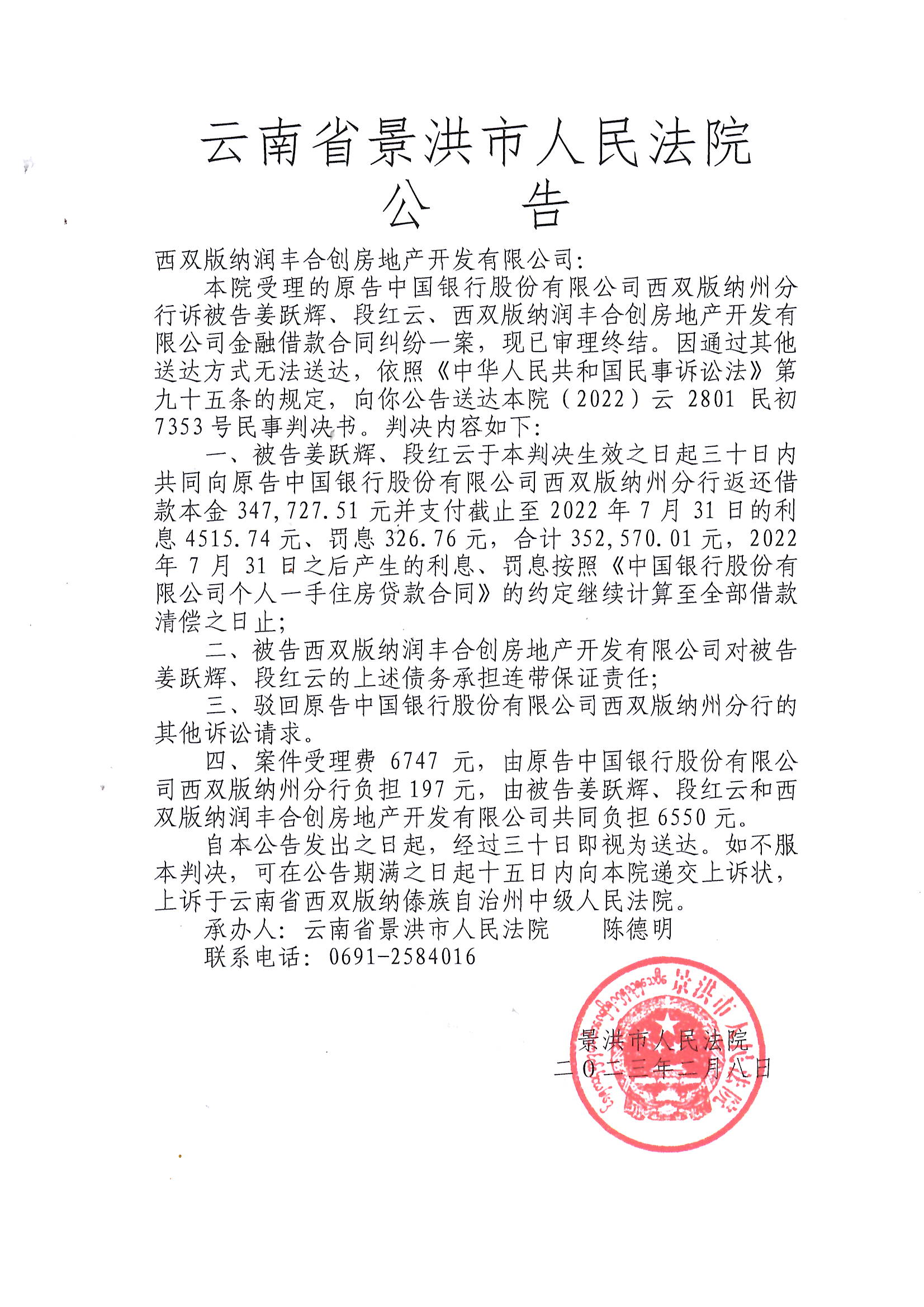 判决公告:西双版纳润丰合创房地产开发有限公司(2022)云2801民初7353号