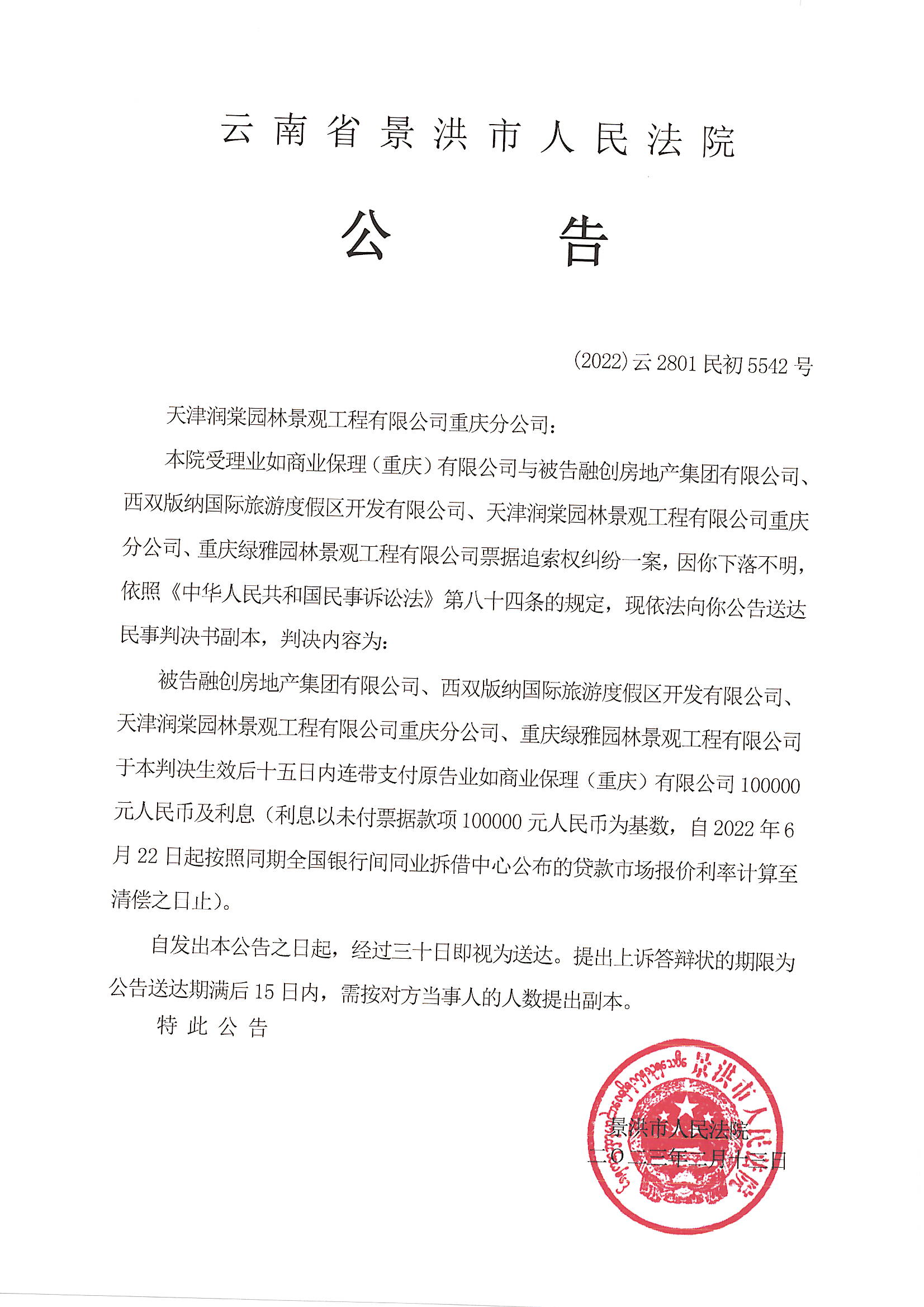 天津润棠园林景观工程有限公司重庆分公司(5542判决公告)