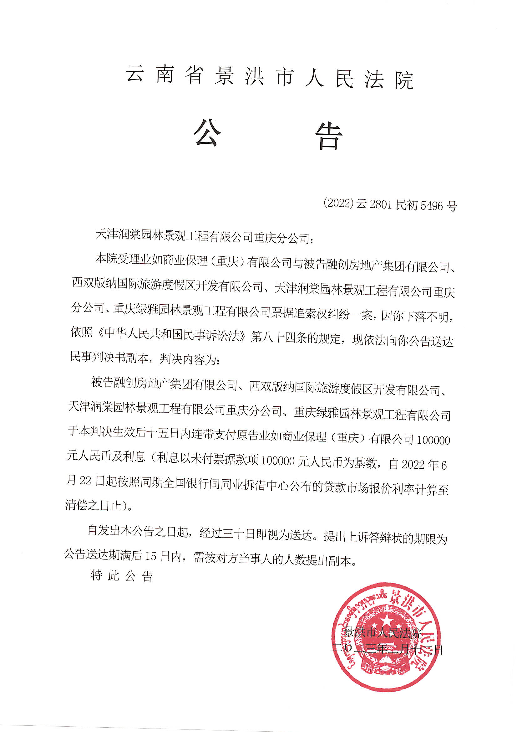 天津润棠园林景观工程有限公司重庆分公司(5496判决公告)