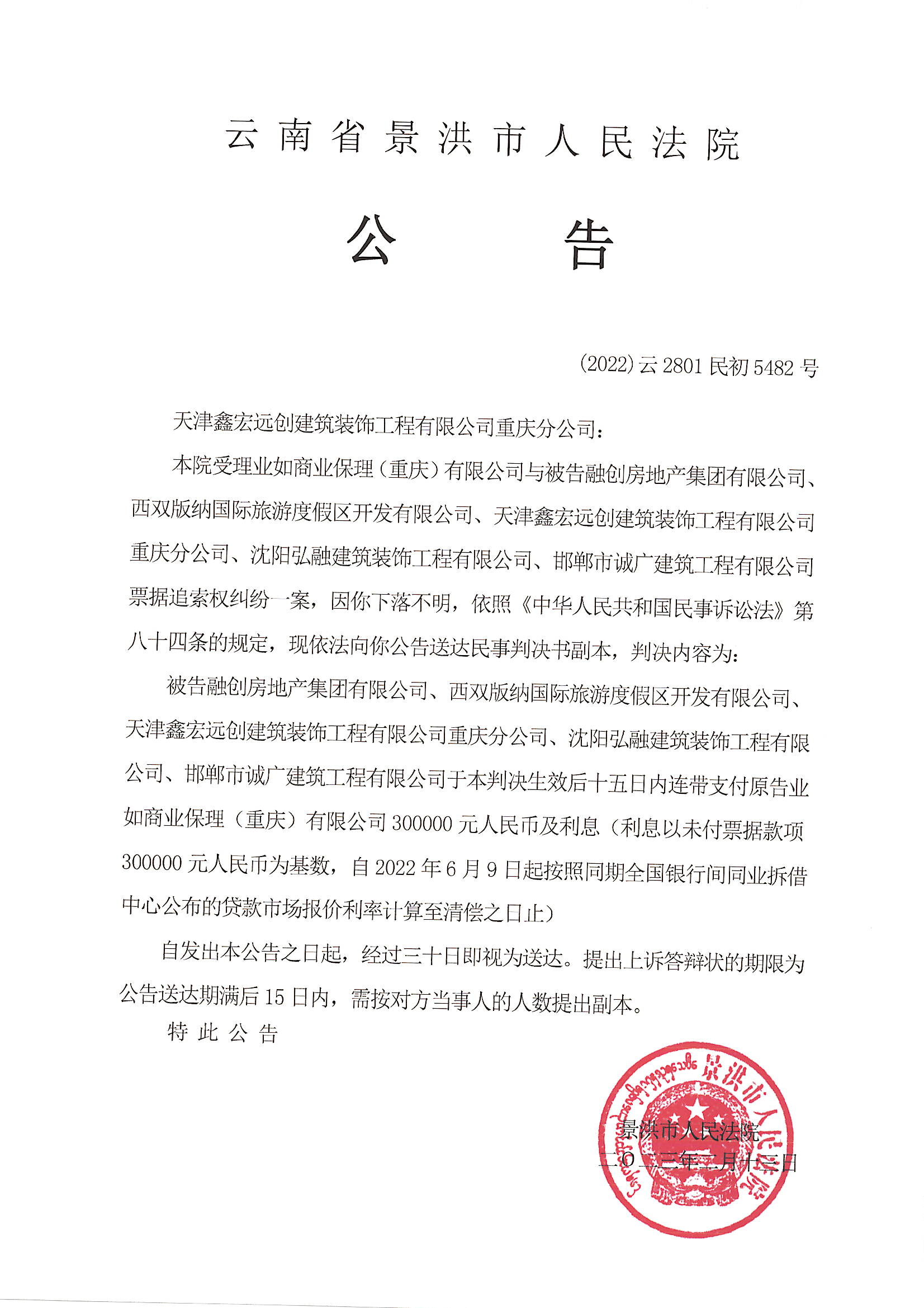 天津鑫宏远创建筑装饰工程有限公司重庆分公司(判决公告)