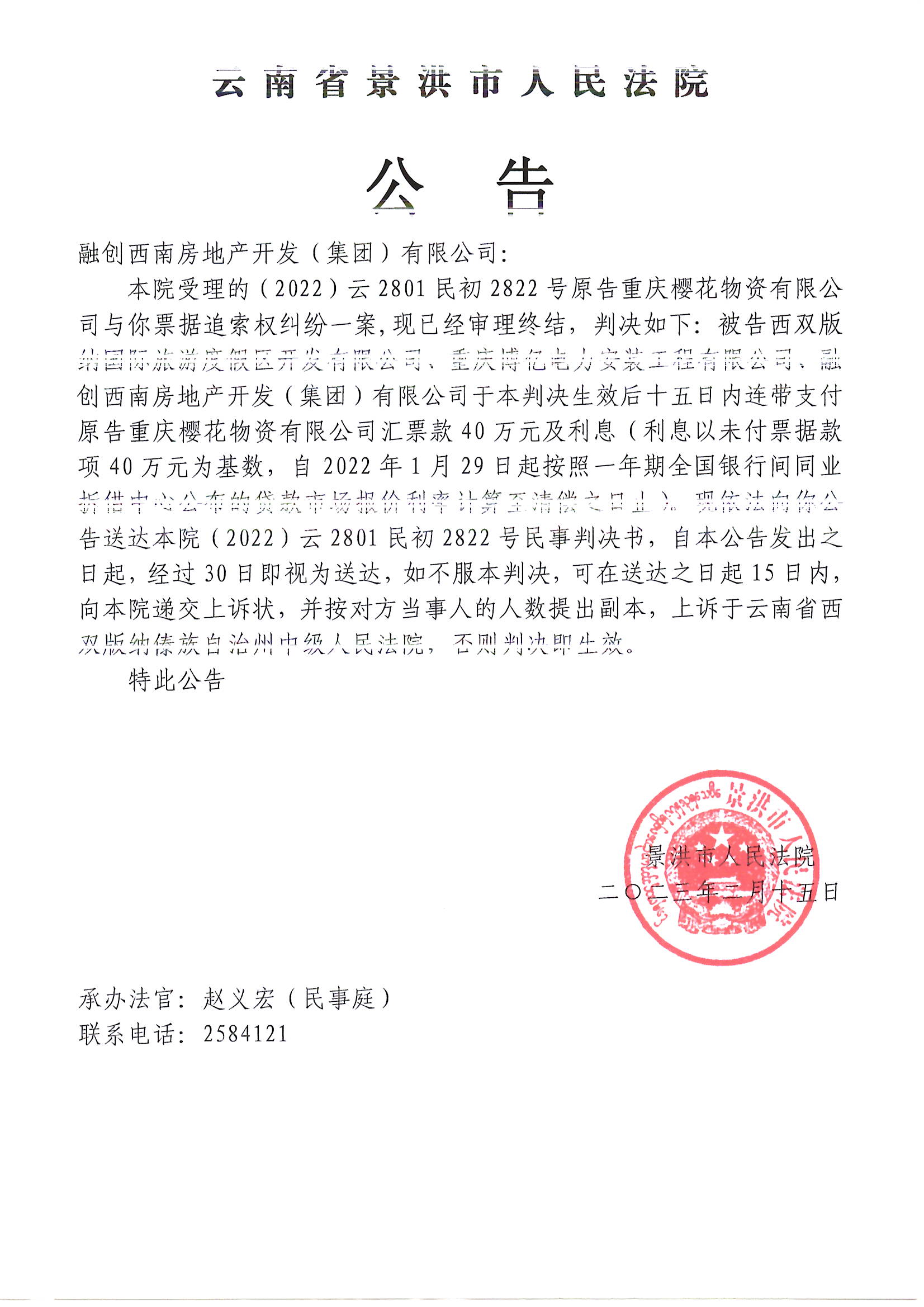 (2022)2822融创西南房地产开发(集团有限公司)判决公告