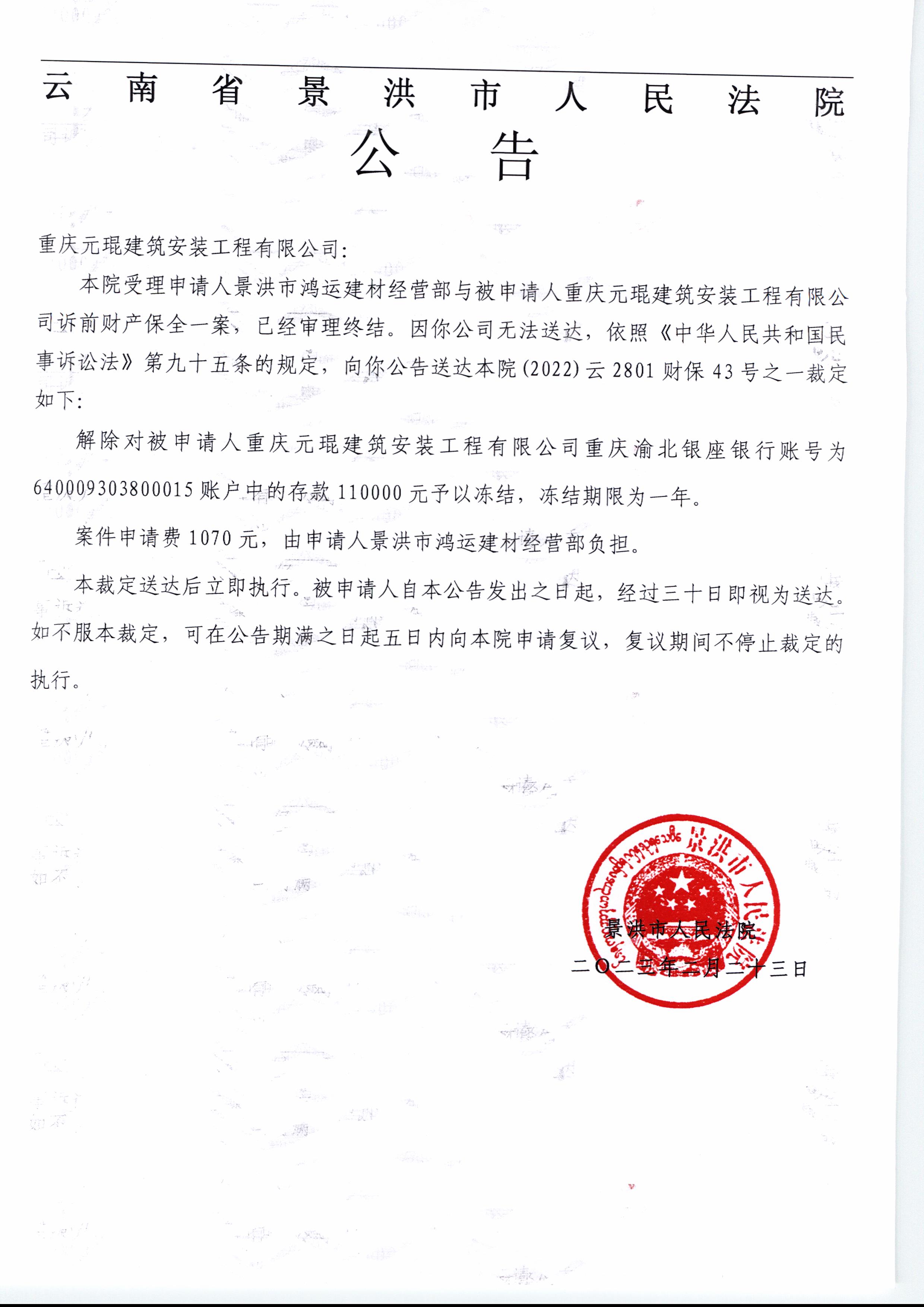 (2022)云2801财保43号之一 重庆元琨建筑安装工程有限公司 裁定公告