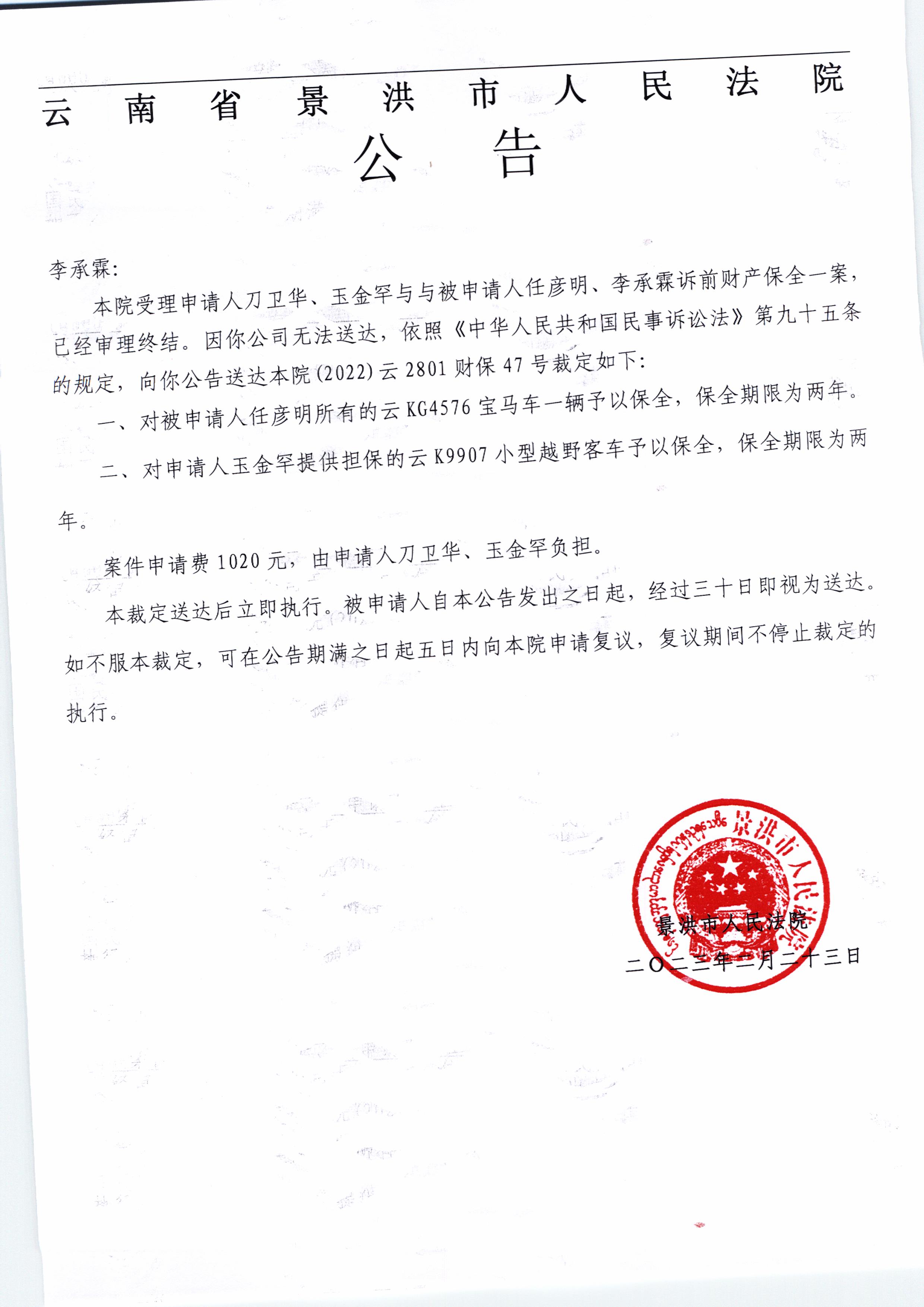 (2022)云2801财保47号 李承霖裁定公告