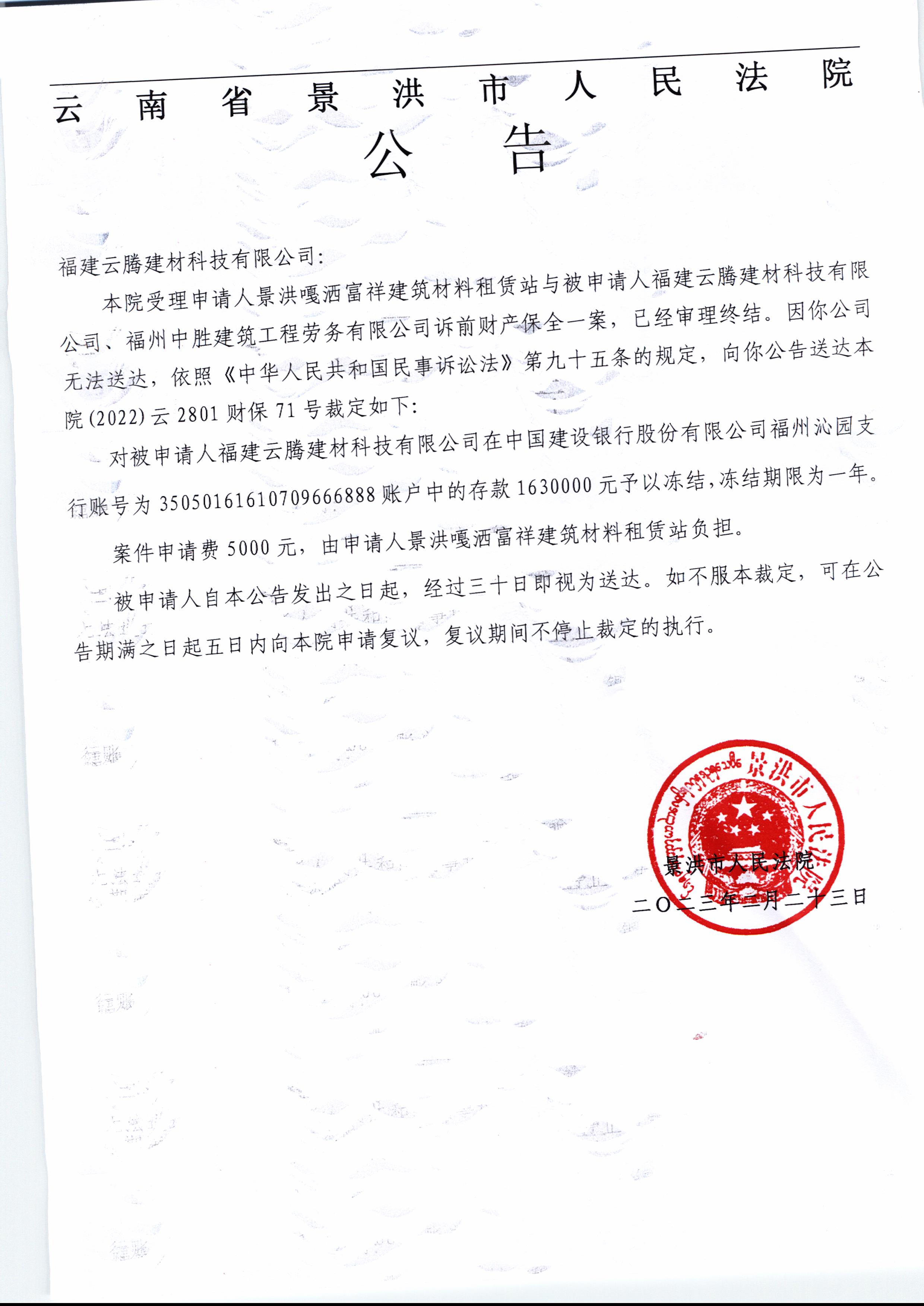 (2022)云2801财保71号 福建云腾建筑科技有限公司 裁定公告