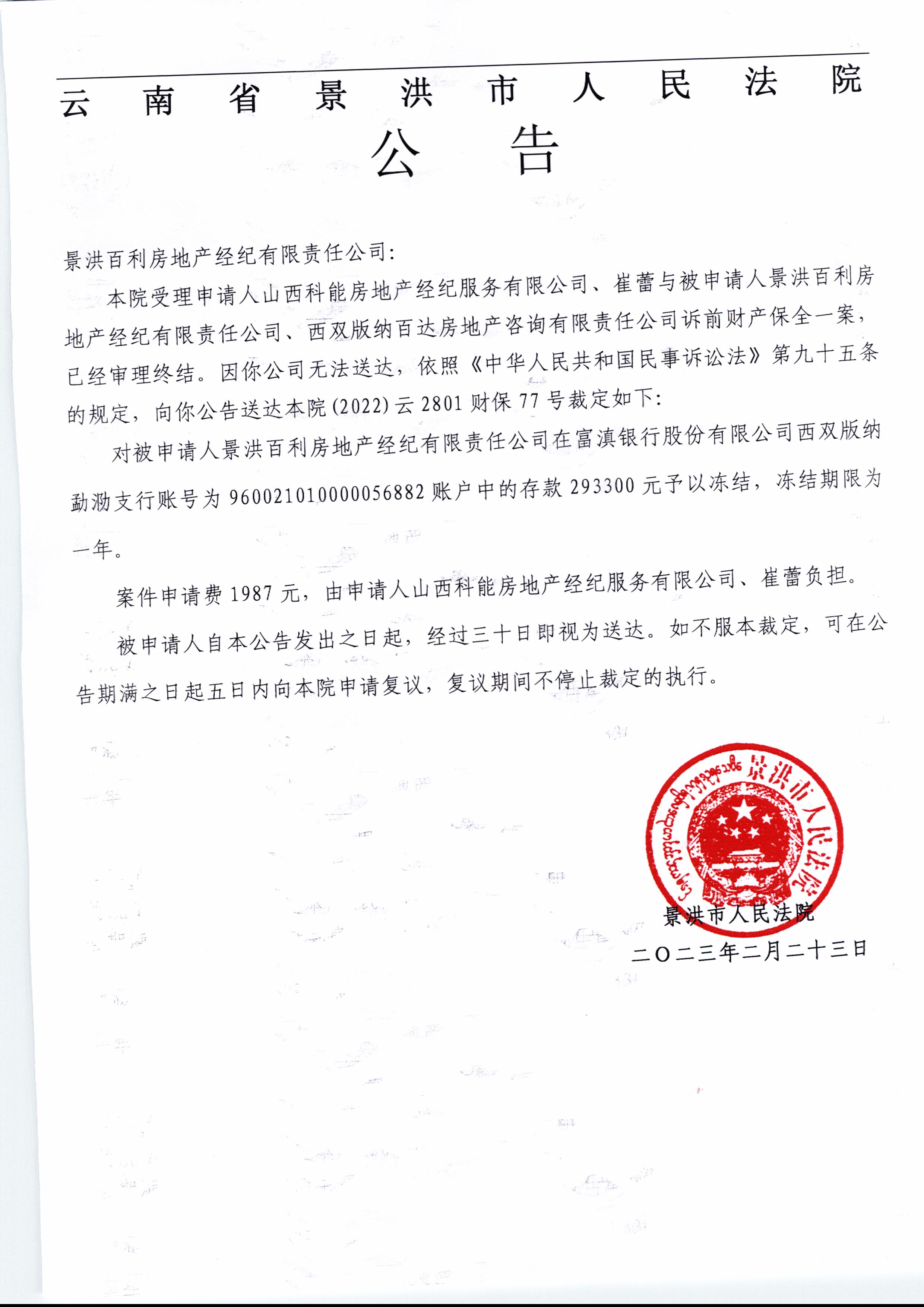 (2022)云2801财保77号景洪百利房地产经纪有限责任公司(裁定) -