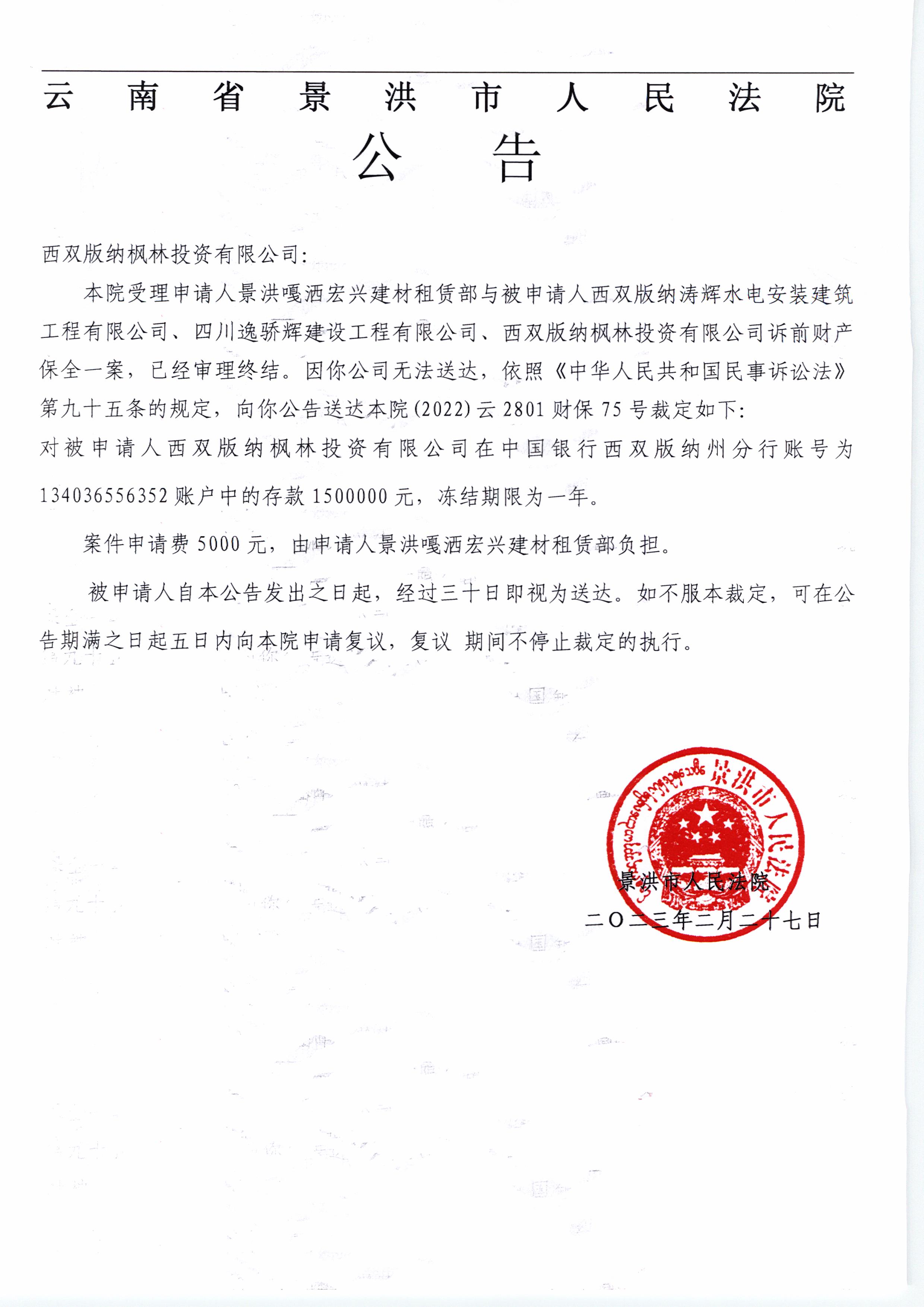 (2022)云2801财保75号 西双版纳枫林投资有限公司 裁定公告