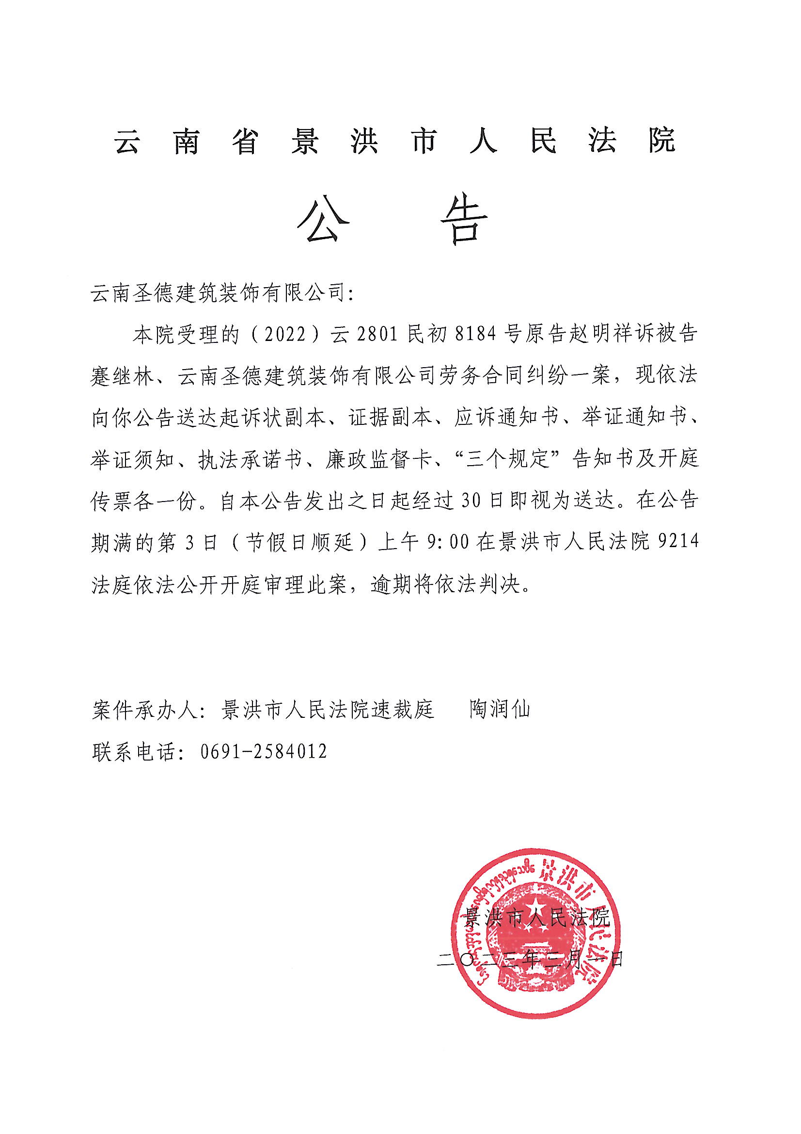 云南圣德建筑装饰有限公司(传票公告)