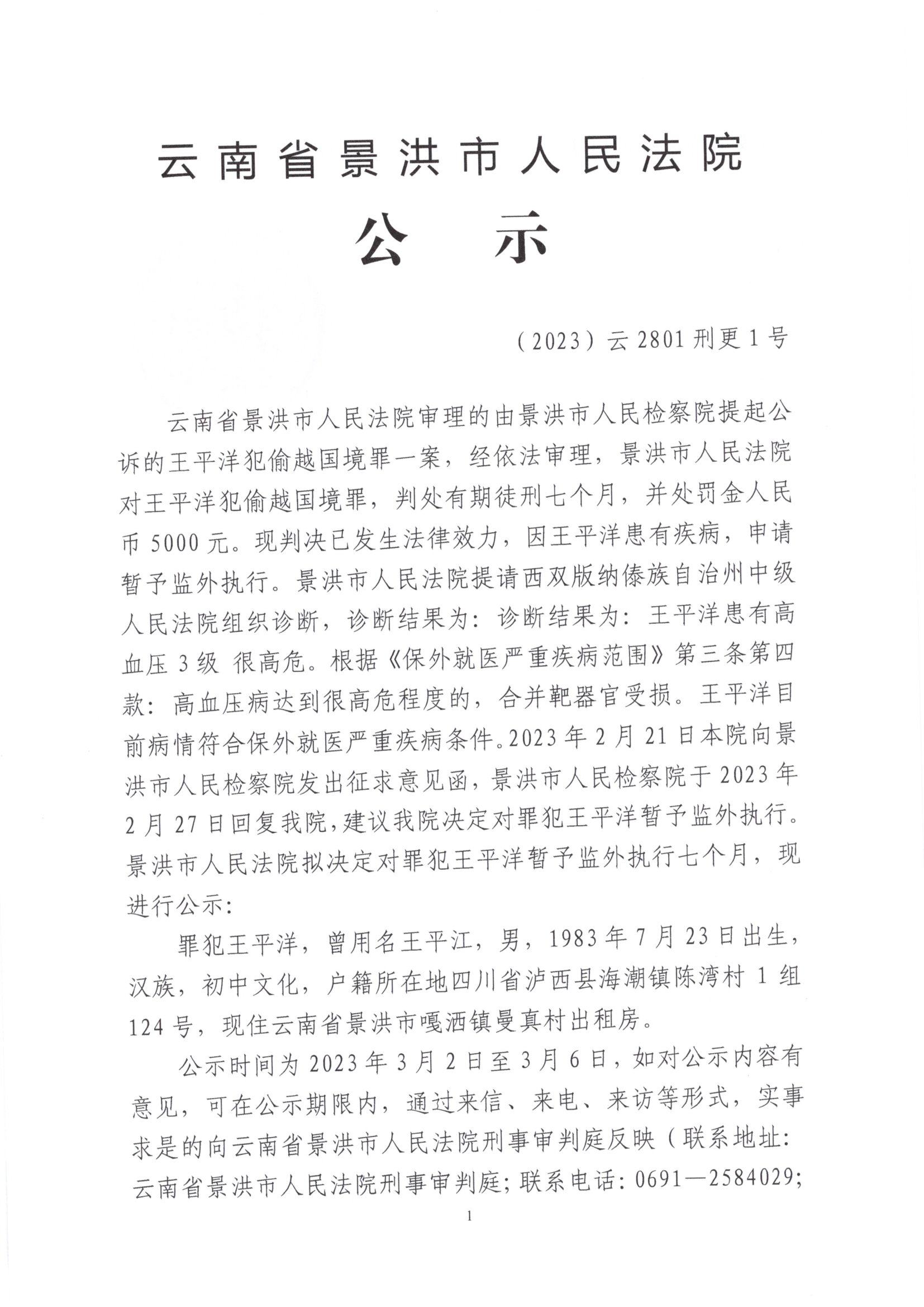 罪犯王平洋犯偷越国境罪(暂予监外执行)