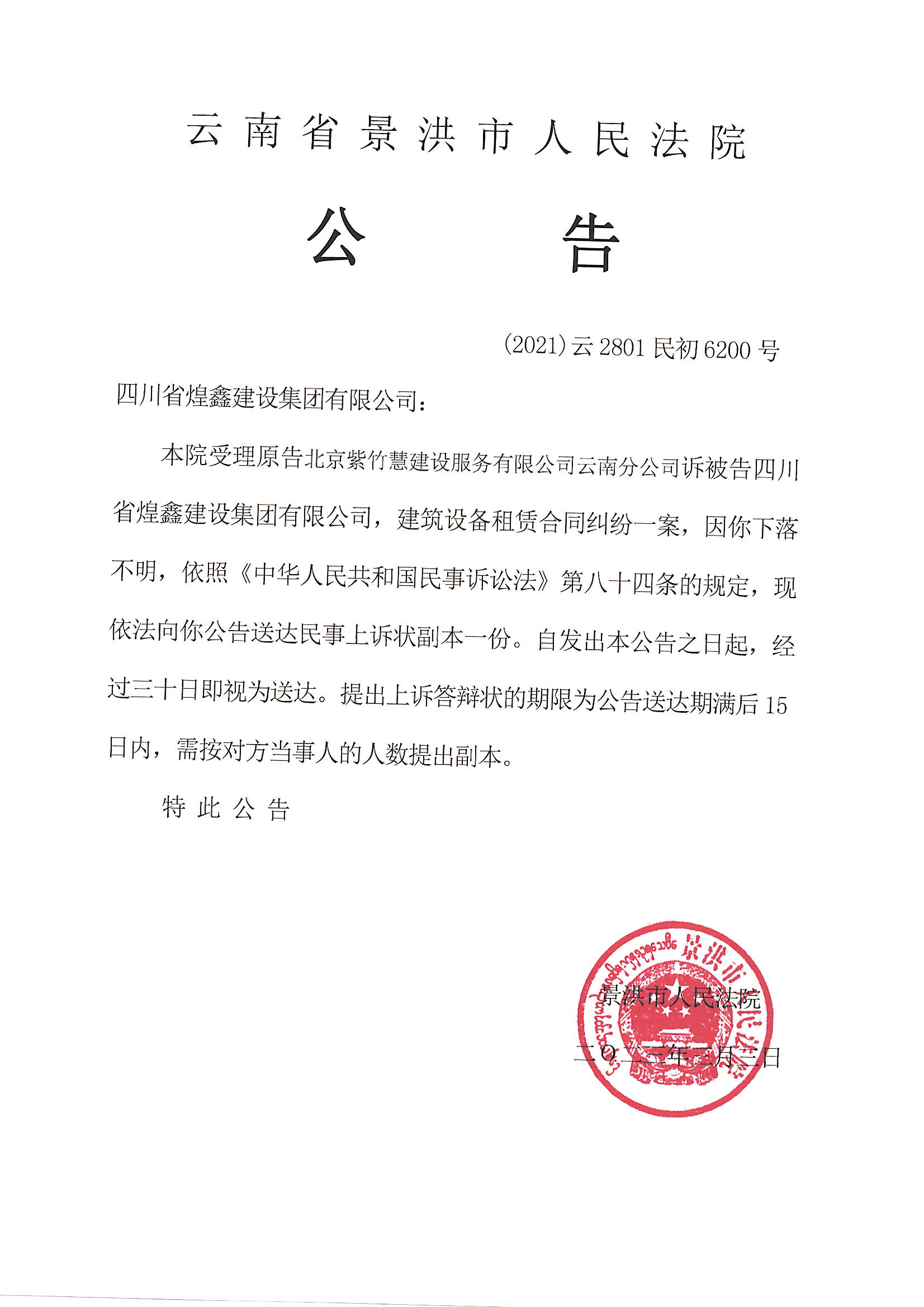 四川省煌鑫建设集团有限公司(上诉状公告)