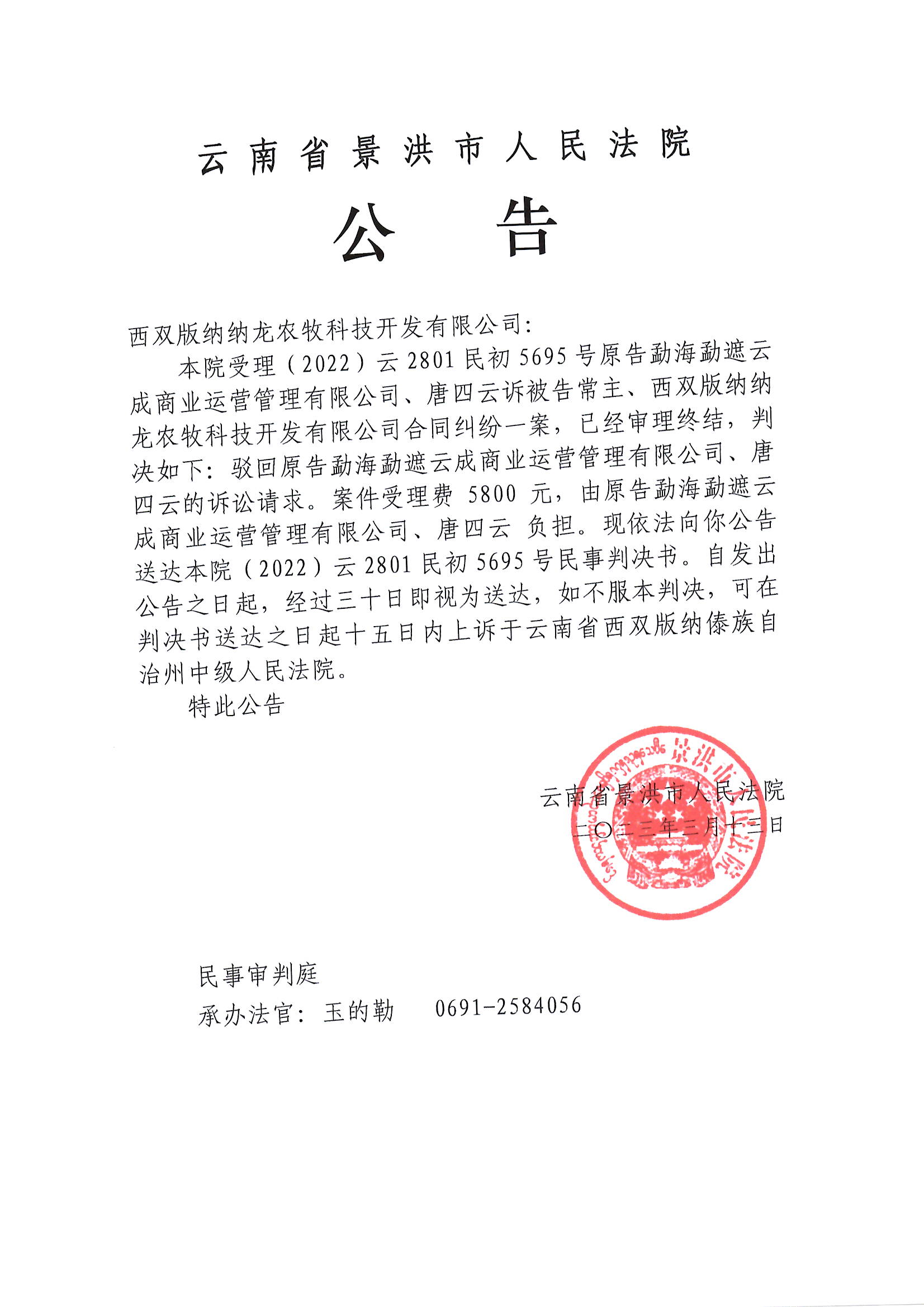 (2022)5695西双版纳纳纳龙农牧科技开发有限公司 (判决公告)