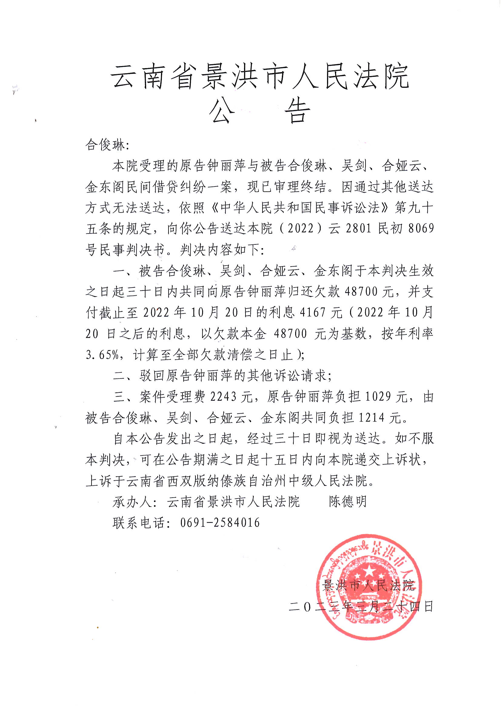 公告判决-合俊琳:(2022)云2801民初8069号民事判决书