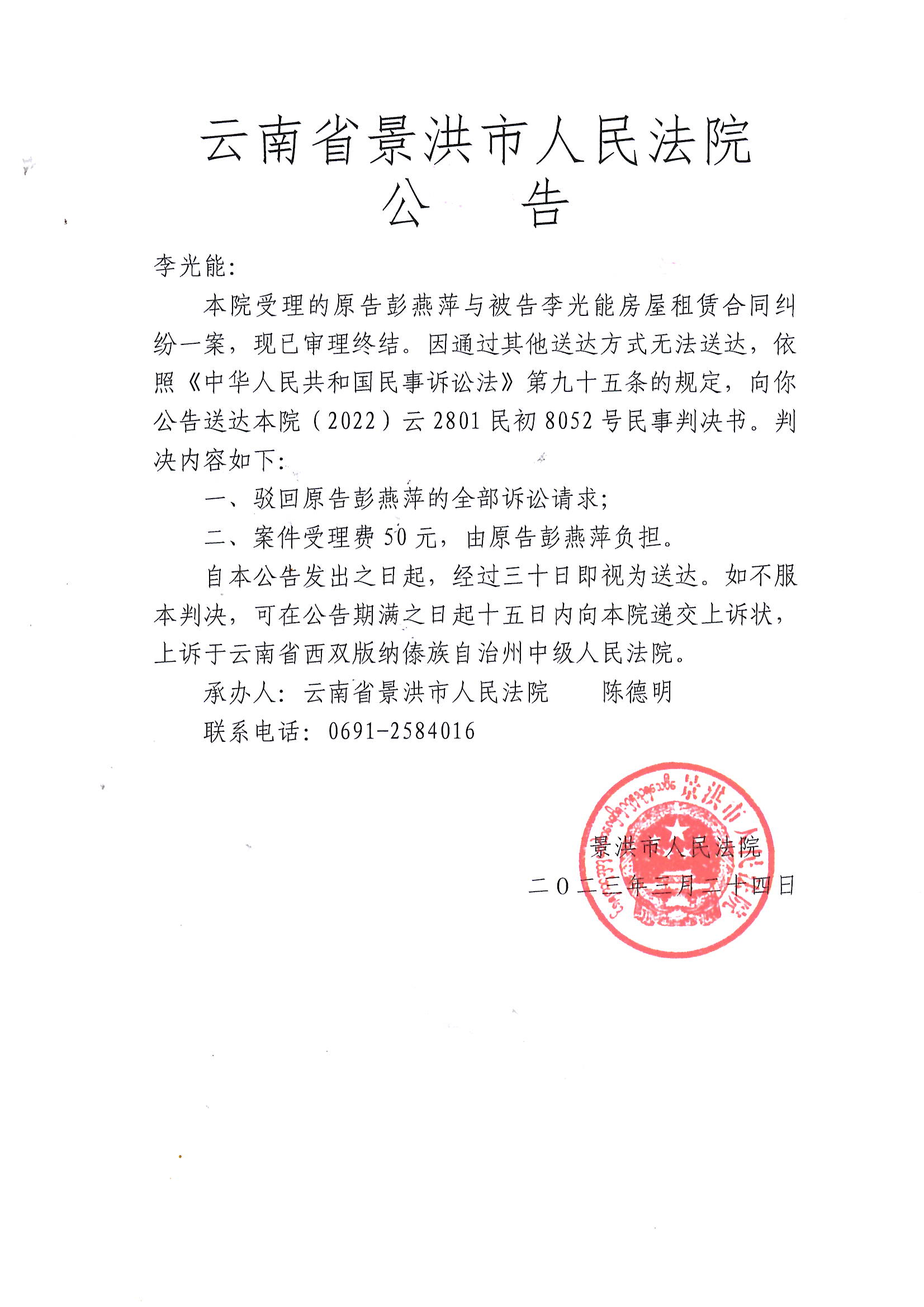 公告判决-李光能:(2022)云2801民初8052号民事判决书