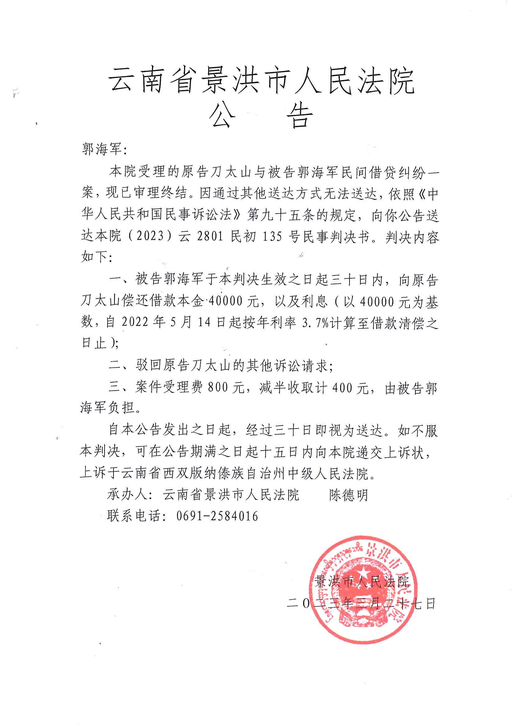 公告判决-郭海军:(2023)云2801民初135号民事判决书