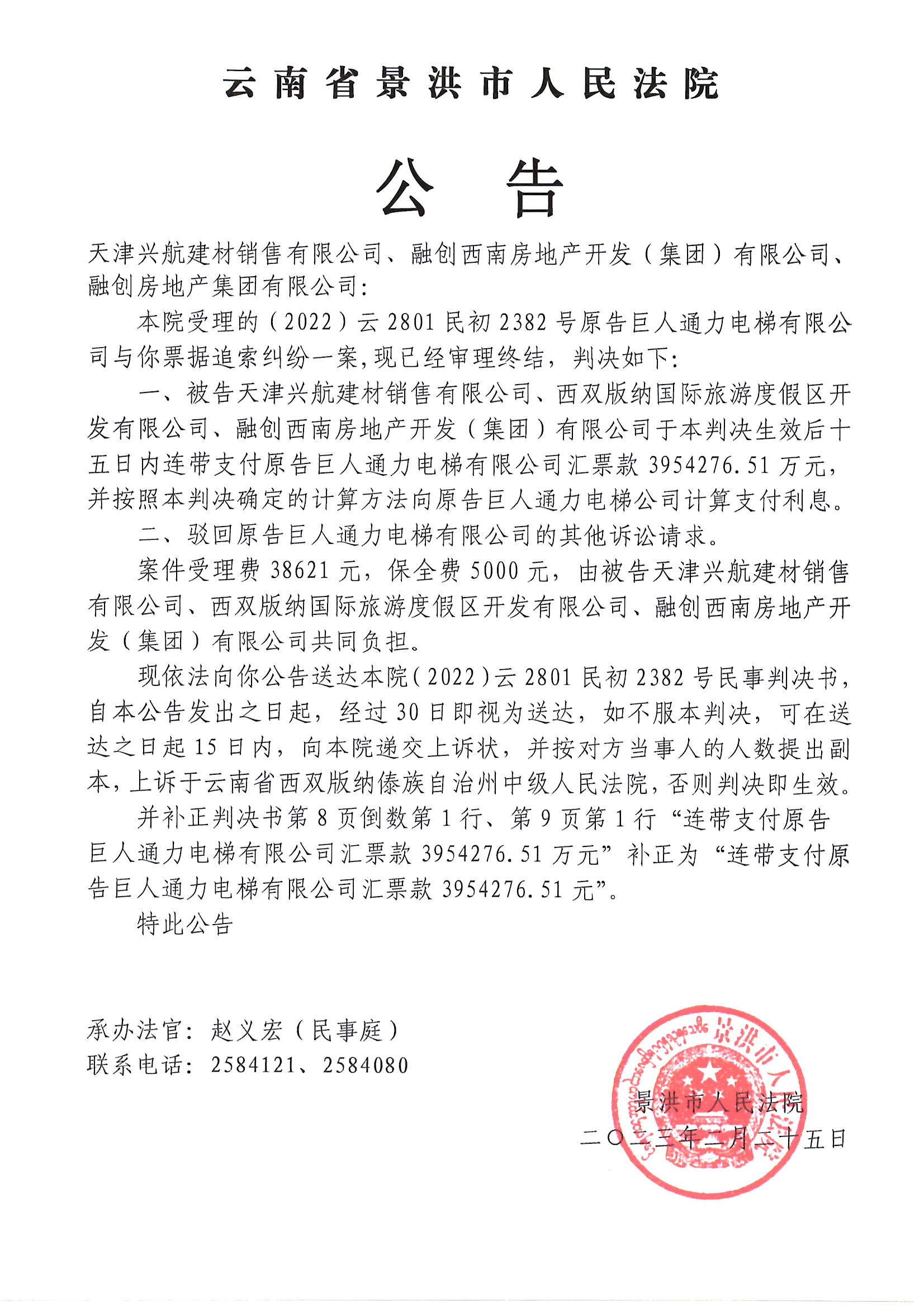 (2022)云2801民初2382号判决及补正裁定公告