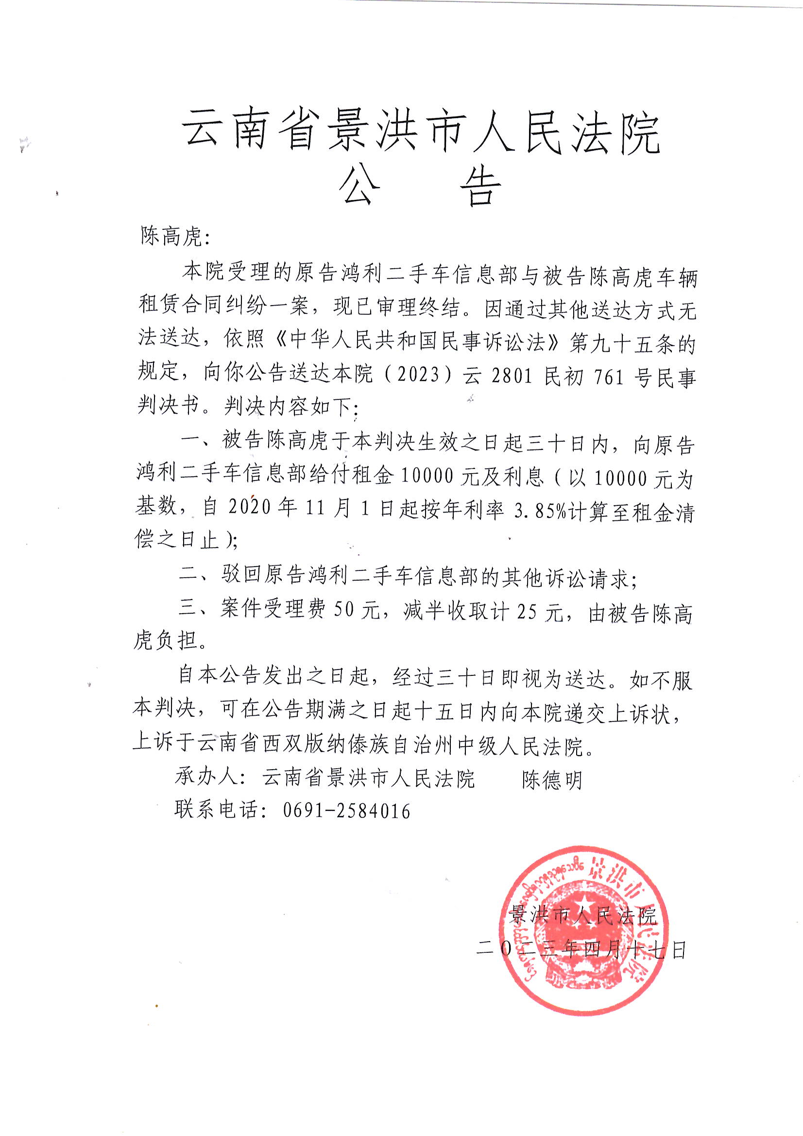 公告判决-陈高虎:(2023)云2801民初761号民事判决书