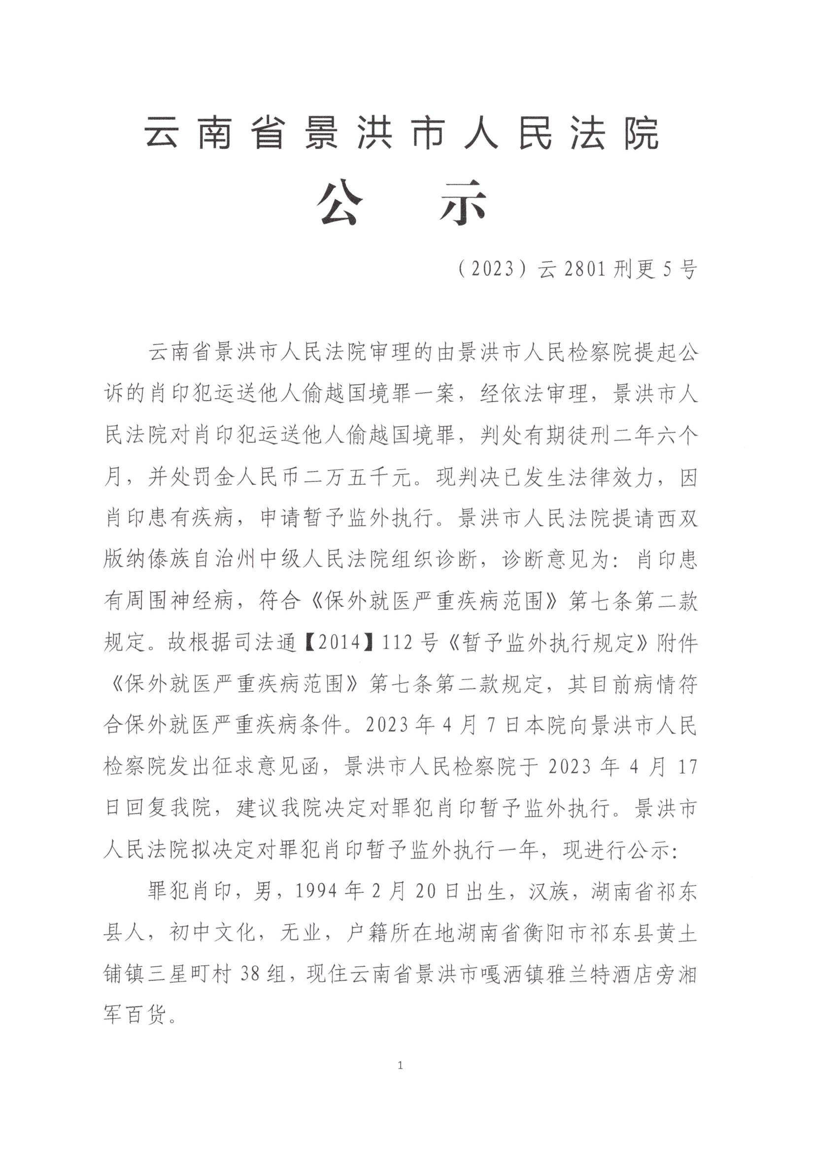 罪犯肖印犯运送他人偷越国境罪(暂予监外执行)