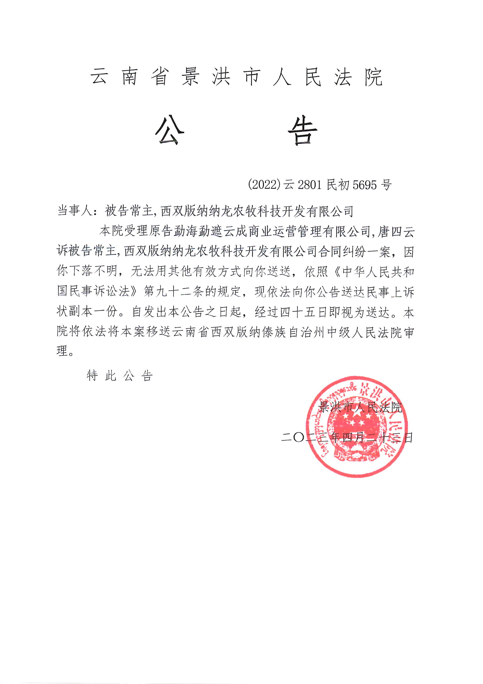 (上诉公告)常主、西双版纳纳龙农牧科技开发有限公司