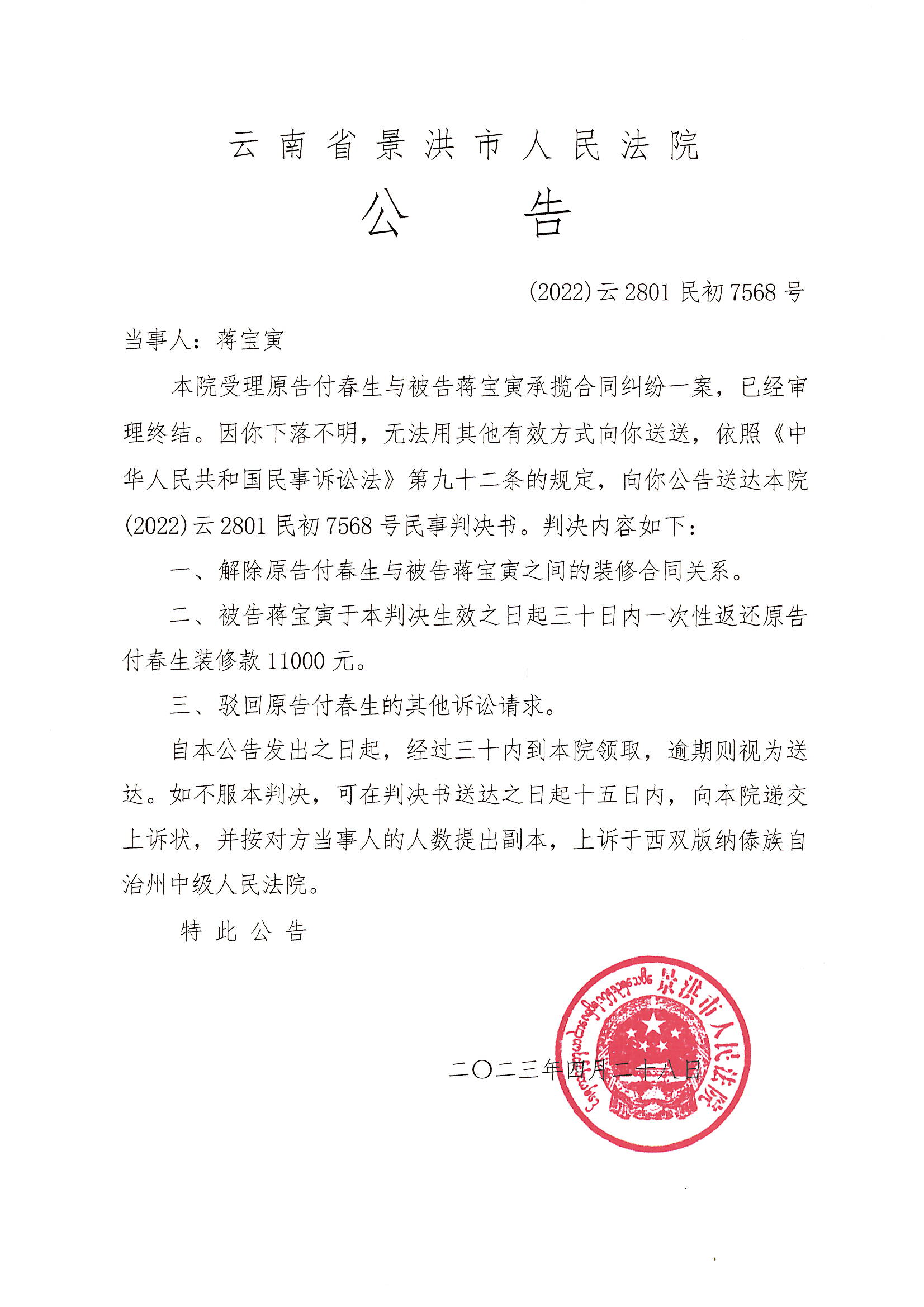 蒋宝寅判决公告(2022民初7568号)