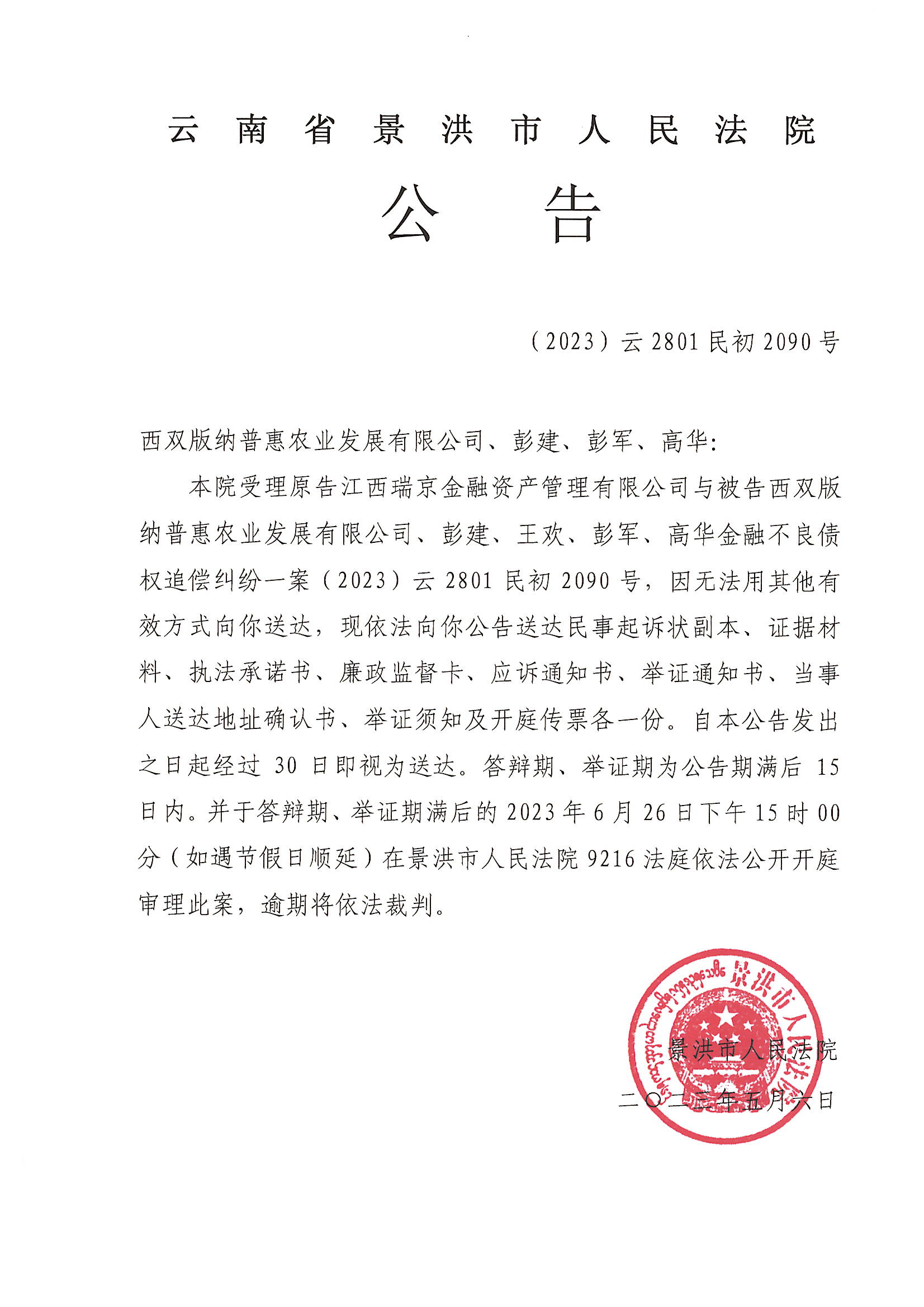 西双版纳普惠农业发展有限公司、彭建、彭军 、高华(2023)2090开庭公告