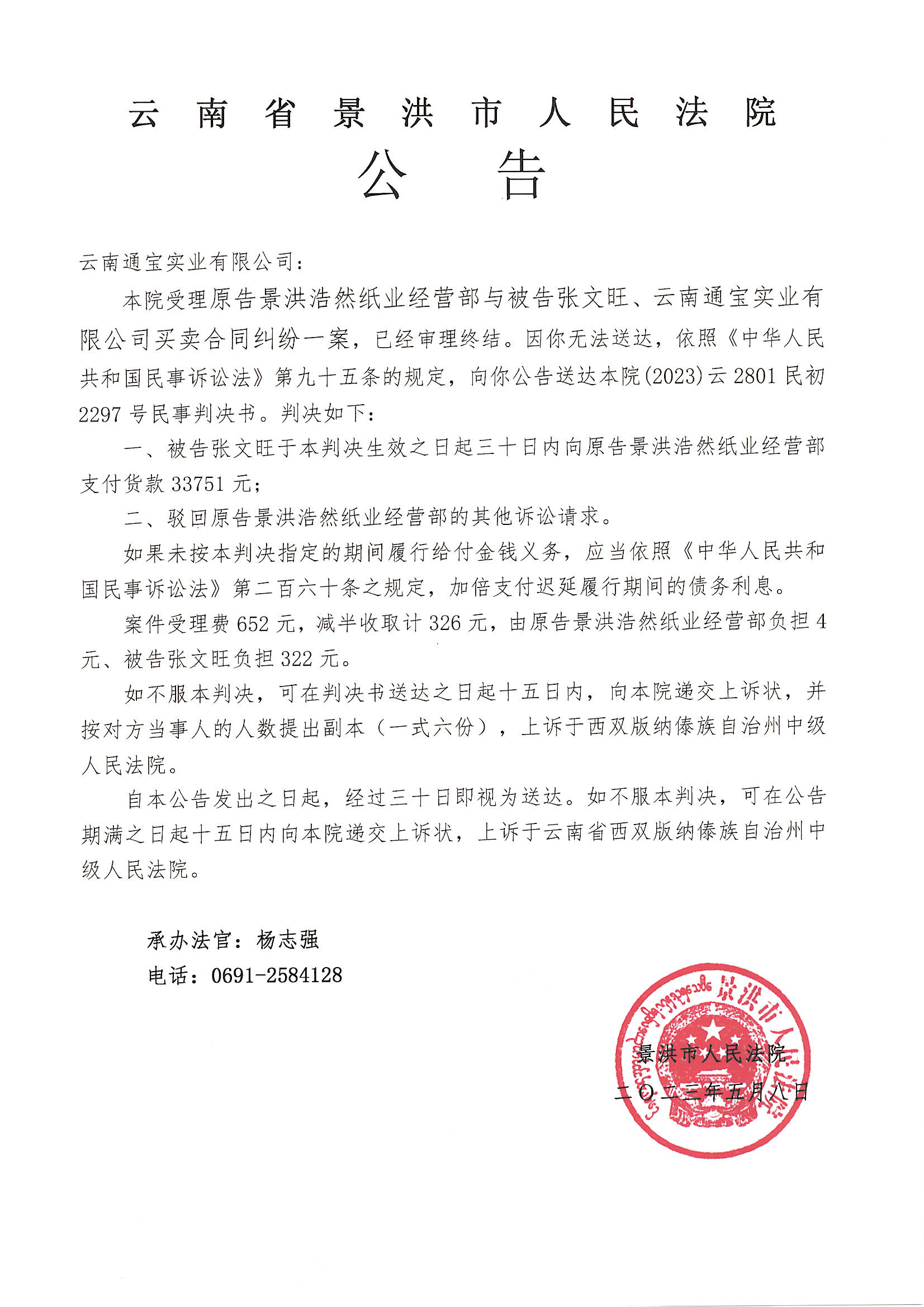 判决公告云南通宝实业有限公司-(2023)云2801民初2297号