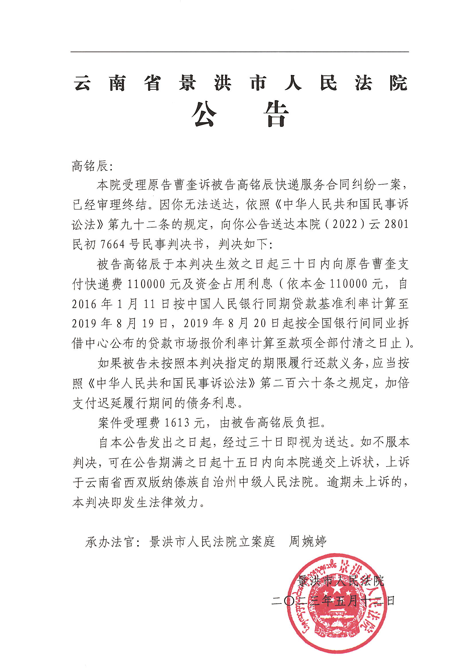 高铭辰(开庭公告)